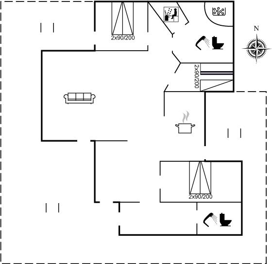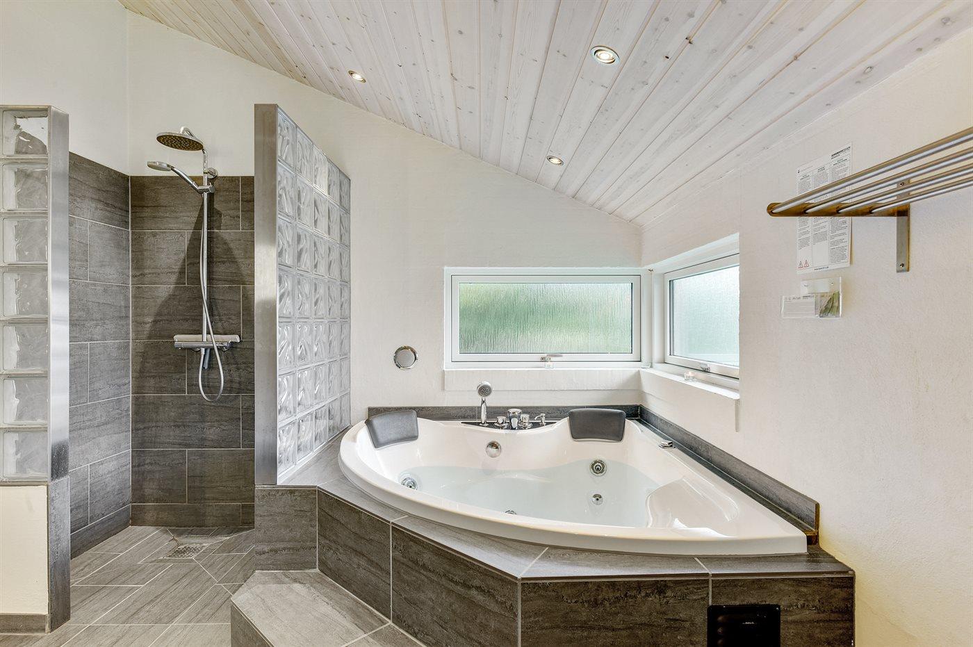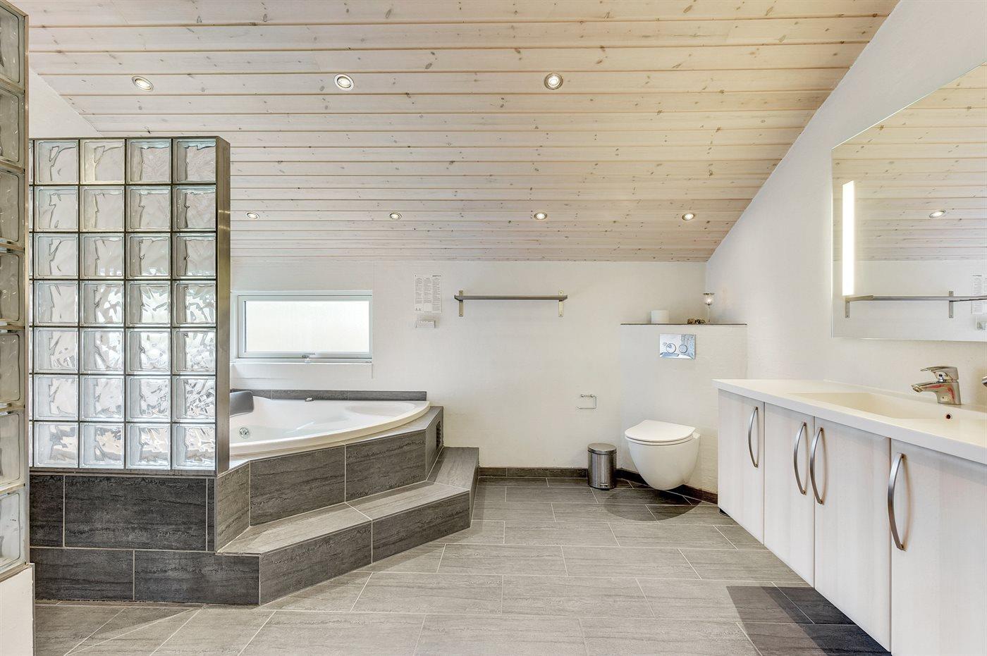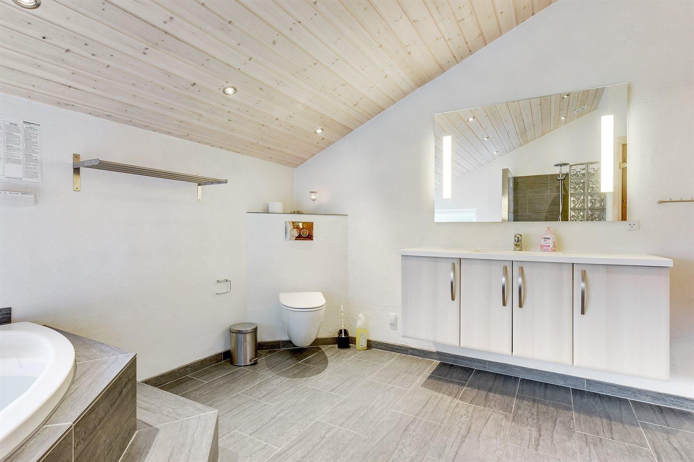 Der er 2 badeværelser med bruseniche og 2 toiletter. Der er gulvvarme på 2 badeværelser. I saunaen er der mulighed for afslapning.