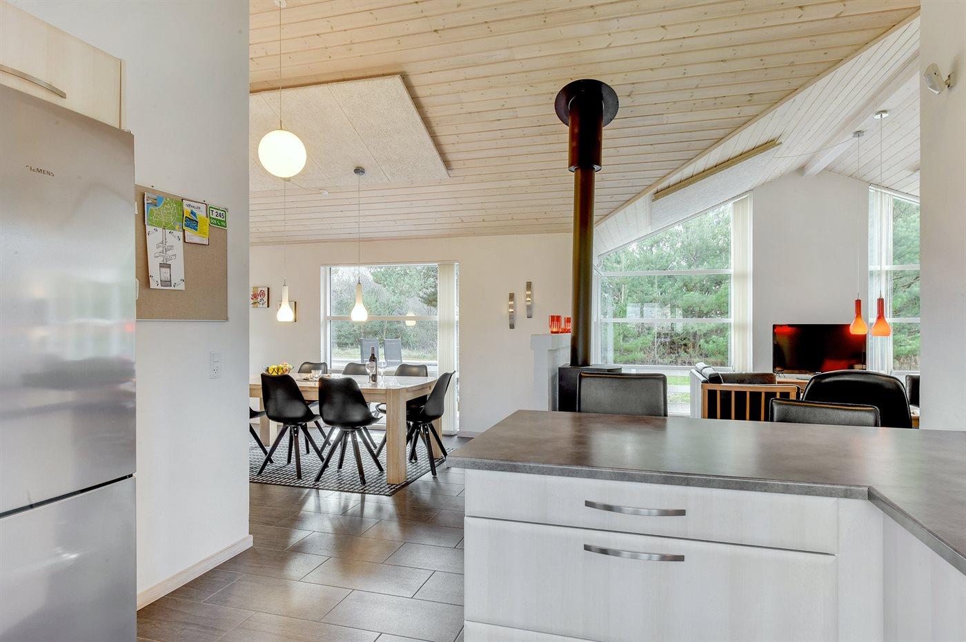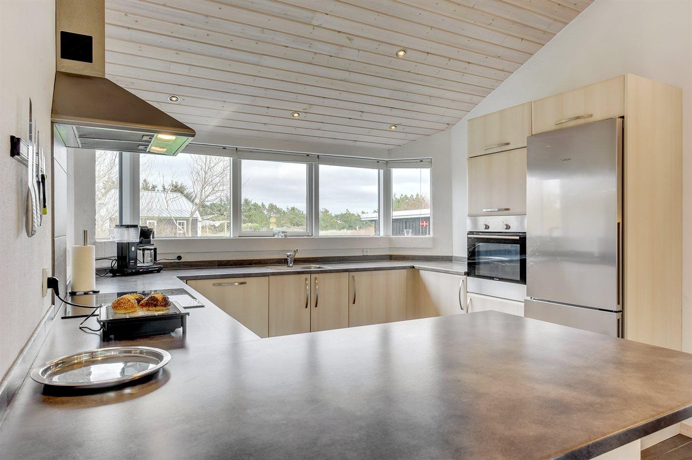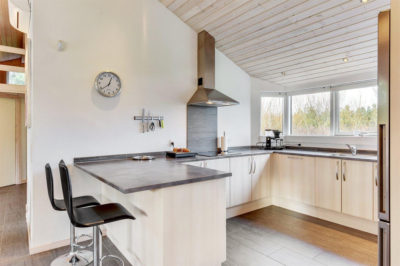 Køkkenet er udstyret med 1 køleskab. Der er 4 keramiske kogeplader, varmluftovn, mikrobølgeovn samt opvaskemaskine.