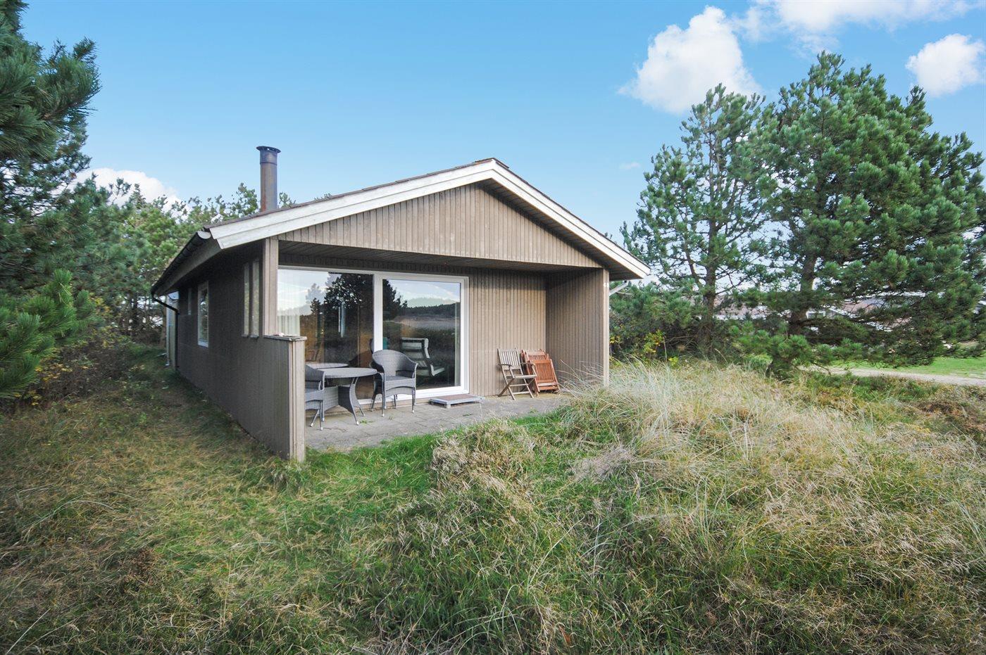 I læ af en beplantning af gran og fyr ligger dette sommerhus en smule tilbagetrukket fra Johns Vej. Fra huset er der en dejlig udsigt over klitheden mod Nystrup Klitplantage.