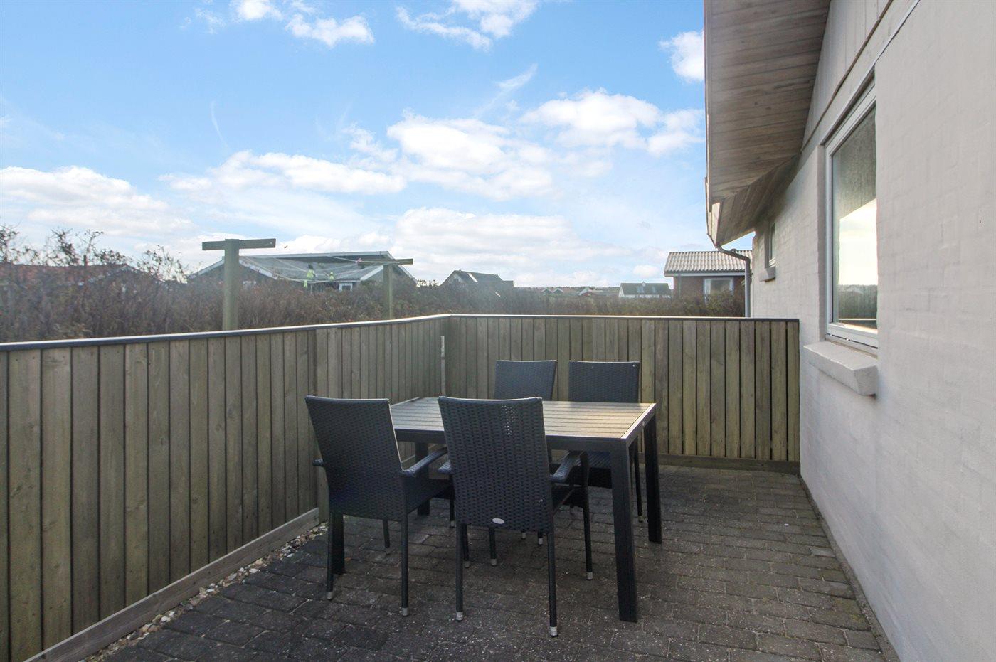 Ferieboligen er beliggende på en 1200 m² stor naturgrund. Der er 75 m til havet. Nærmeste forretning er beliggende i en afstand af 1000 m. Til ferieboligen hører 38 m² terrasseareal. Heraf i alt 38 m² lukket terrasse. Der er redskabsrum. Her forefindes fryser med en kapacitet på 100 liter, ekstra køleskab, vaskemaskine samt tørretumbler. Grill til rådighed. Parkering ved ferieboligen.