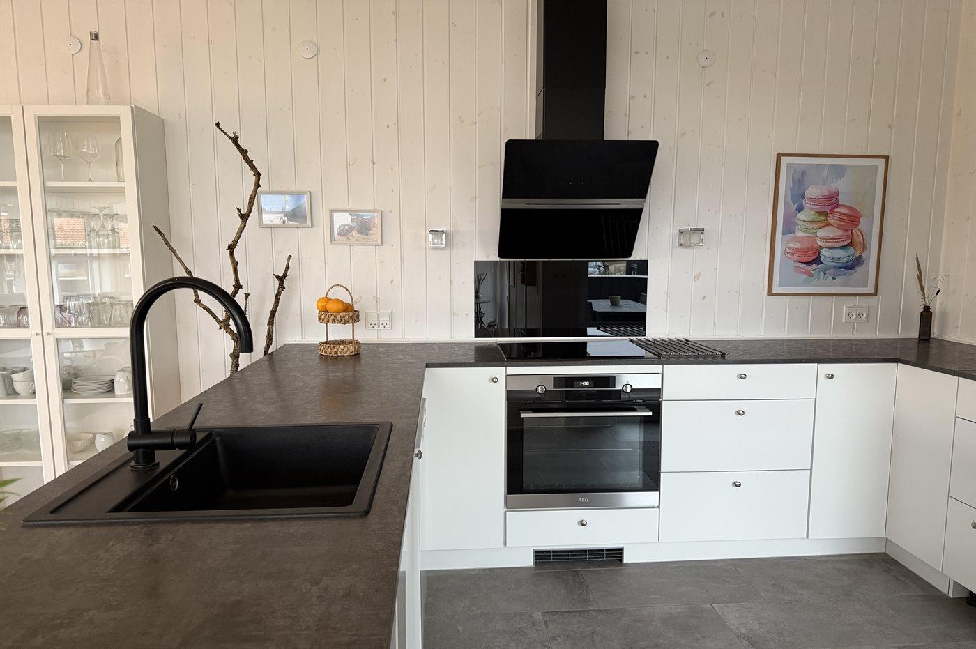 Køkkenet er udstyret med 1 køleskab. Der er 4 keramiske kogeplader, varmluftovn, mikrobølgeovn samt opvaskemaskine.
