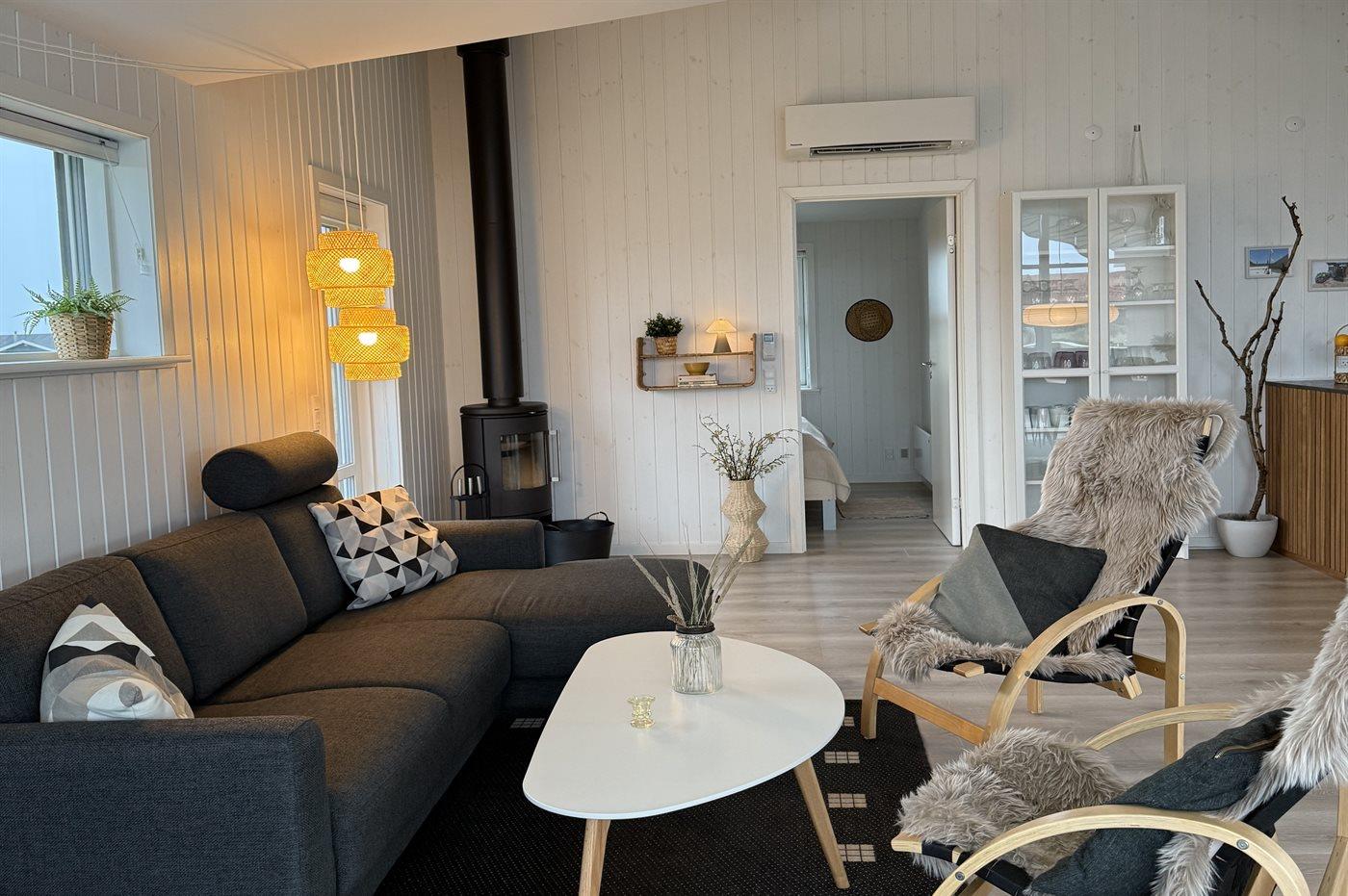 Sommerhuset egner sig til 6 personer. Ferieboligen er på 106 m² og er bygget i 2021. Det er ikke tilladt at medbringe husdyr. Ferieboligen er udstyret med energibesparende varmepumpe. Der er gulvvarme i alle klinkegulve. Der er gulvvarme i entréen. Ferieboligen har vaskemaskine. Tørretumbler. Frysekapacitet på 80 liter. Der er desuden brændeovn. Til de små er der 1 stk. barnestol.
