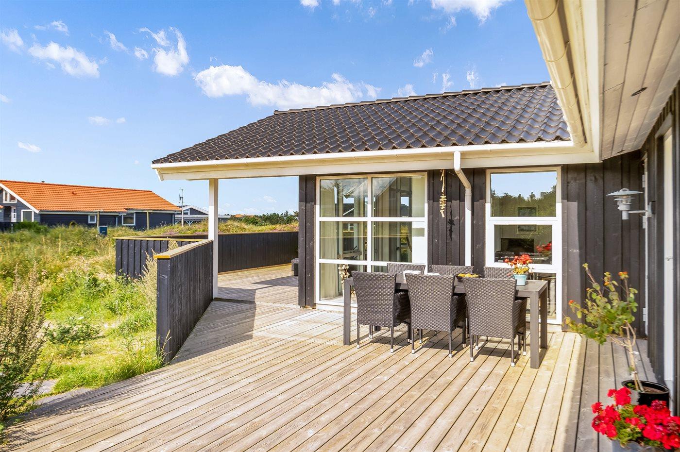 Ferieboligen er beliggende på en 1200 m² stor naturgrund. Der er 350 m til havet. Nærmeste forretning er beliggende i en afstand af 350 m. Til ferieboligen hører 100 m² terrasseareal. Desuden er der 13 m² overdækket terrasse. Der er redskabsrum. Sandkasse. Udendørs bruser. Grill til rådighed. Parkering ved ferieboligen.