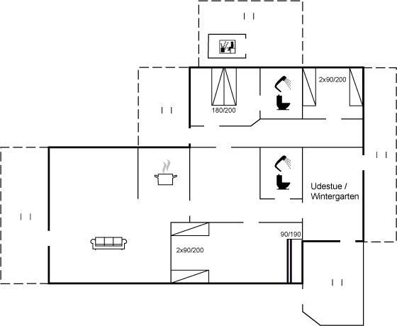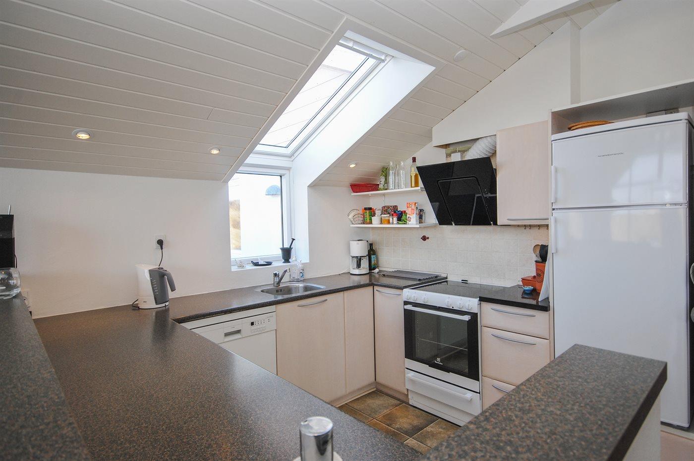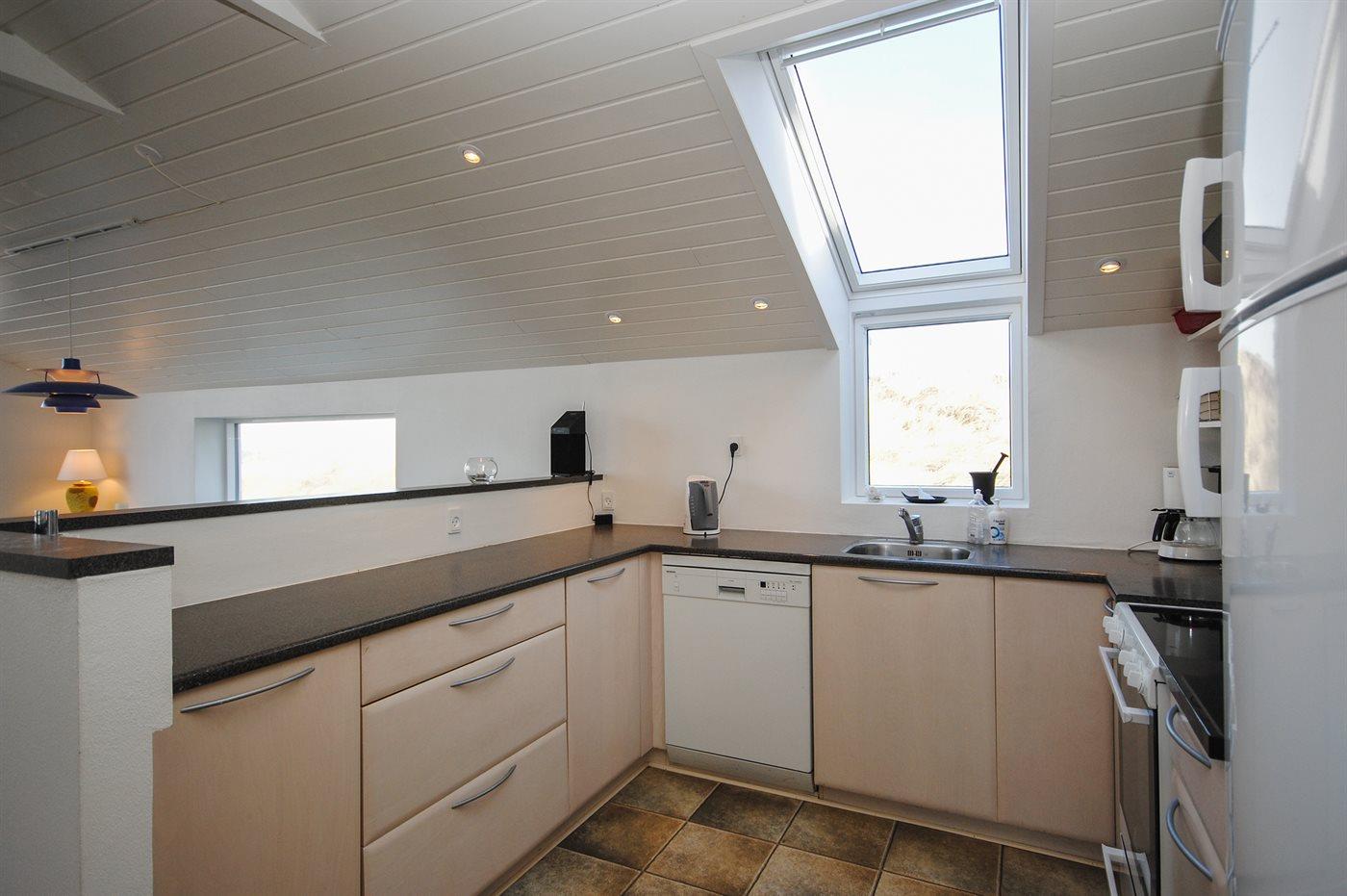 Køkkenet er udstyret med 1 køleskab. Der er 4 induktionskogeplader, varmluftovn samt opvaskemaskine.