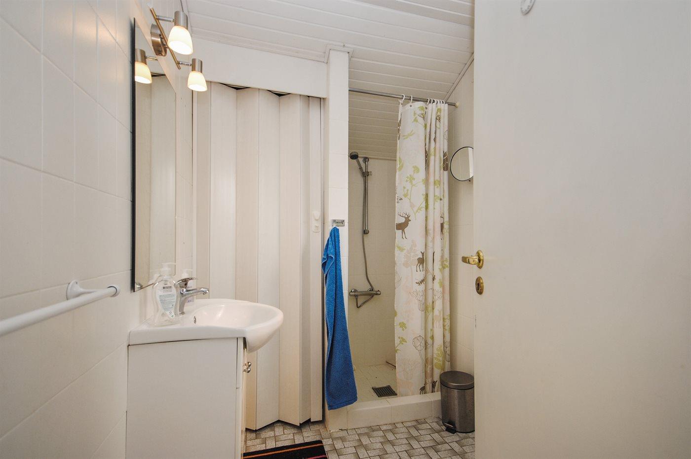 Der er 2 badeværelser med bruseniche og 2 toiletter. Der er gulvvarme på 1 badeværelse. I saunaen er der mulighed for afslapning.