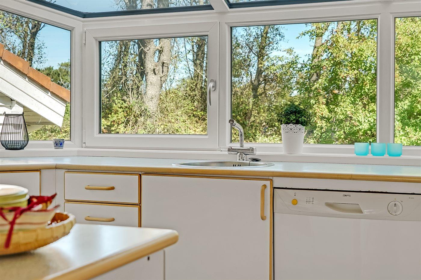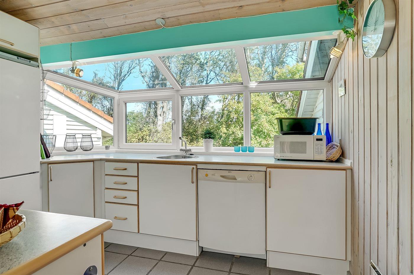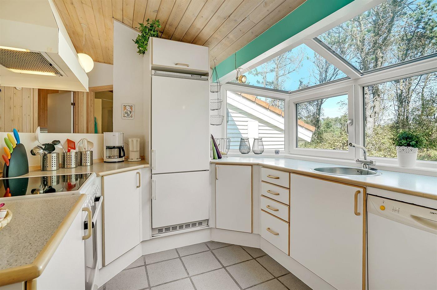 Køkkenet er udstyret med 1 køleskab. Der er 4 keramiske kogeplader, varmluftovn, mikrobølgeovn samt opvaskemaskine.