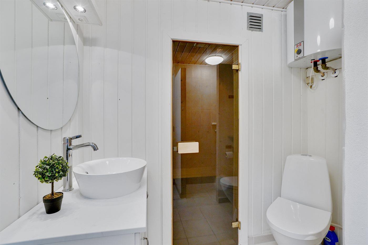 Der er 1 badeværelse med bruseniche og 2 toiletter, heraf 1 gæstetoilet I saunaen er der mulighed for afslapning.