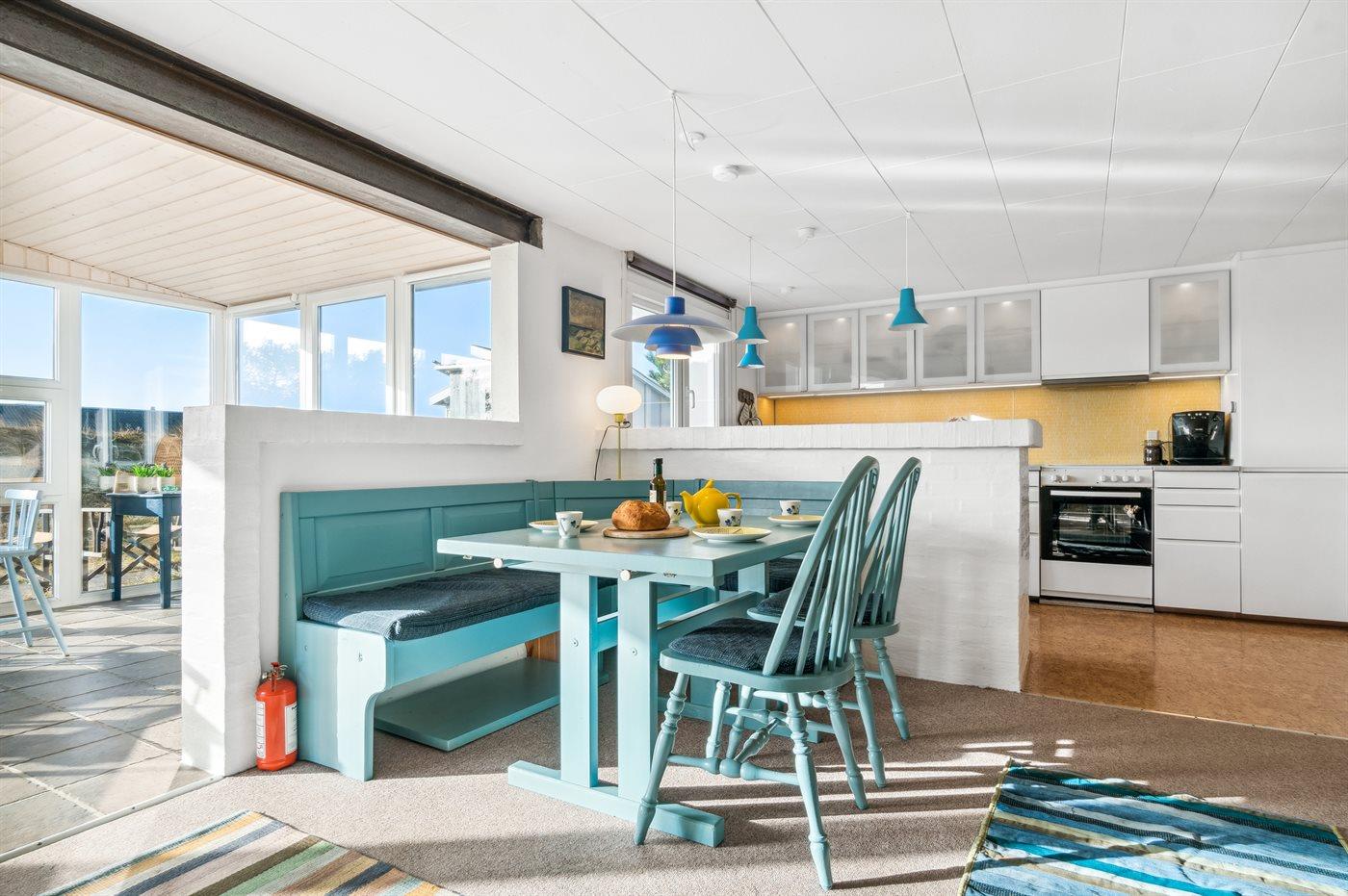 Køkkenet er udstyret med 1 køleskab. Der er 4 keramiske kogeplader, varmluftovn, mikrobølgeovn samt opvaskemaskine.