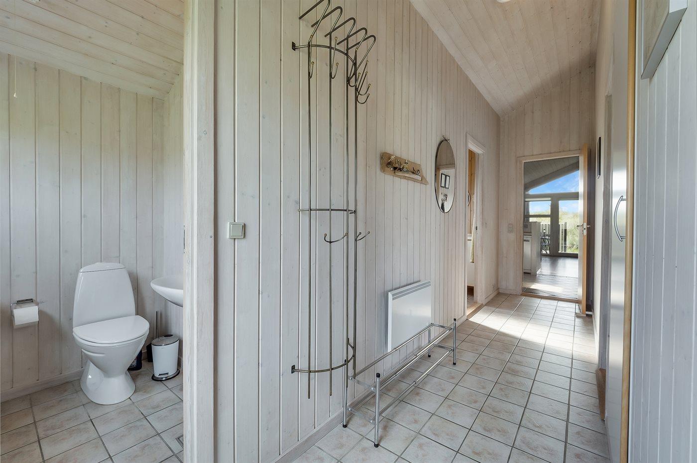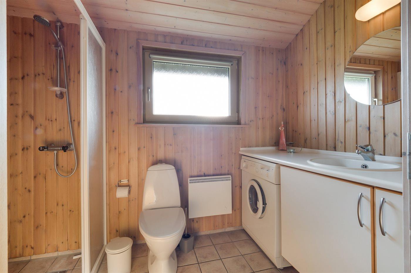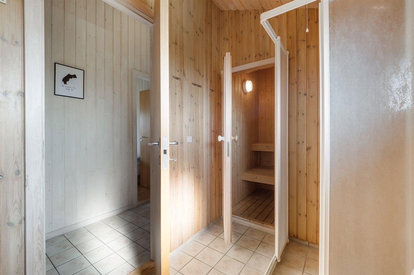 Der er 1 badeværelse med bruseniche og 2 toiletter, heraf 1 gæstetoilet. Der er gulvvarme på 1 badeværelse. Der er gulvvarme på gæstetoilettet. I saunaen er der mulighed for afslapning.