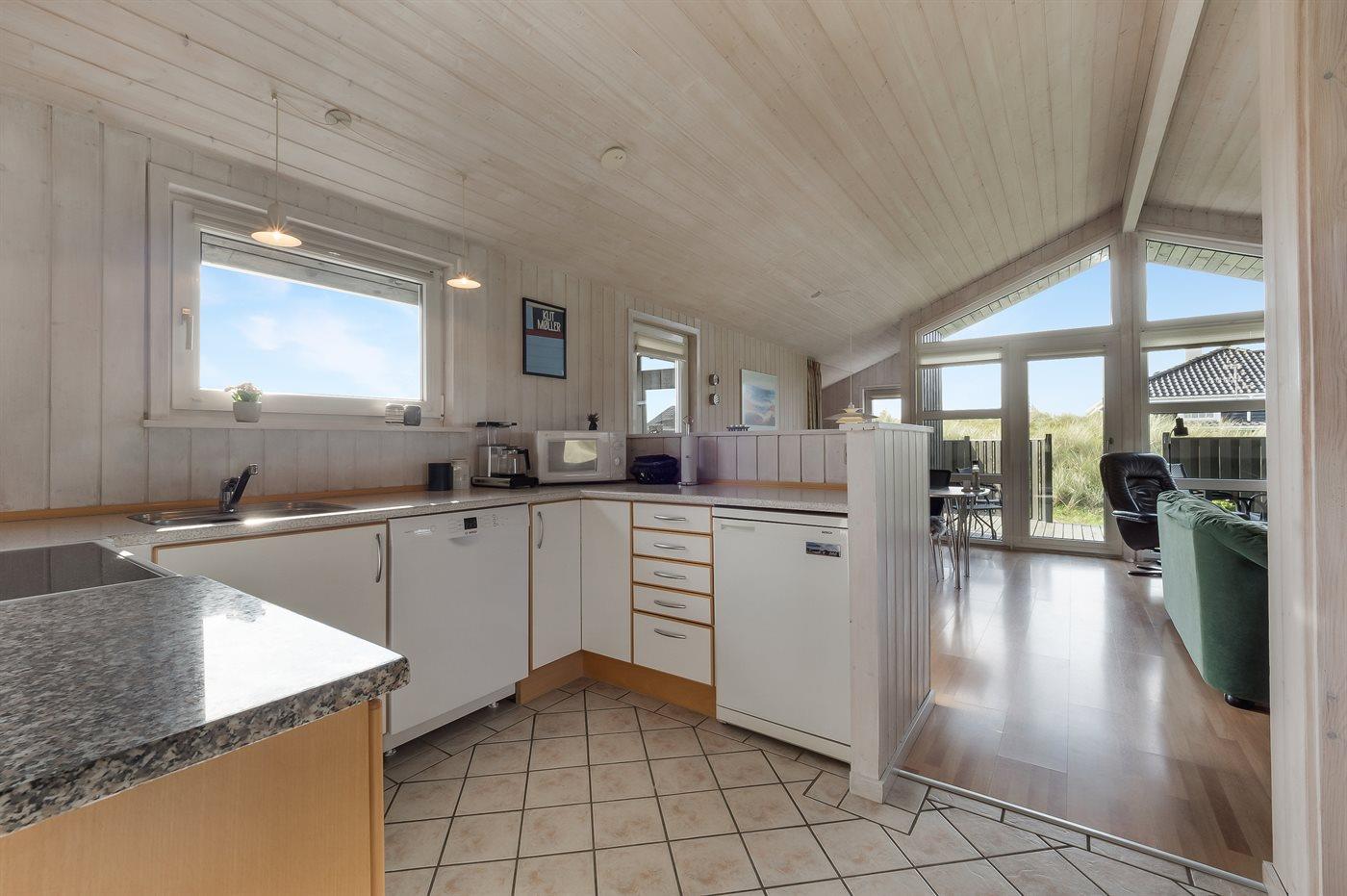 Køkkenet er udstyret med 1 køleskab. Der er 4 keramiske kogeplader, varmluftovn, mikrobølgeovn samt opvaskemaskine.