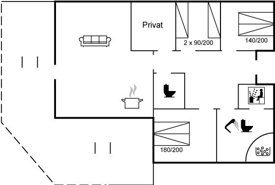 Der er i alt 3 soveværelser. Sovepladserne fordeler sig på: 4 sovepladser i dobbeltsenge. 2 sovepladser i enkeltsenge. Derudover er der 1 stk. barneseng.