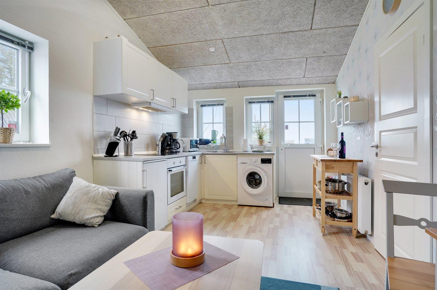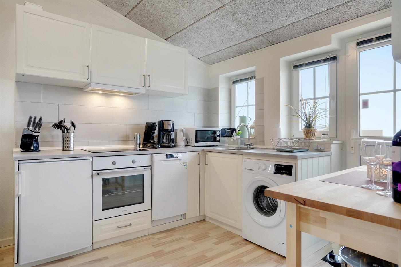 Køkkenet er udstyret med 1 køleskab. Der er 4 keramiske kogeplader, varmluftovn, mikrobølgeovn samt opvaskemaskine.