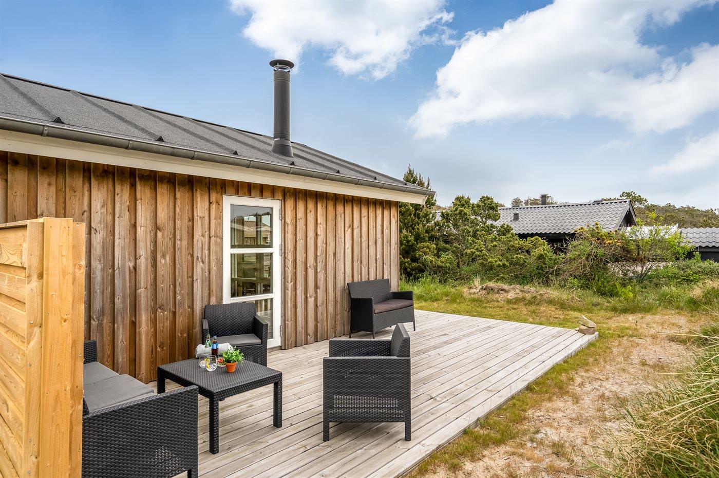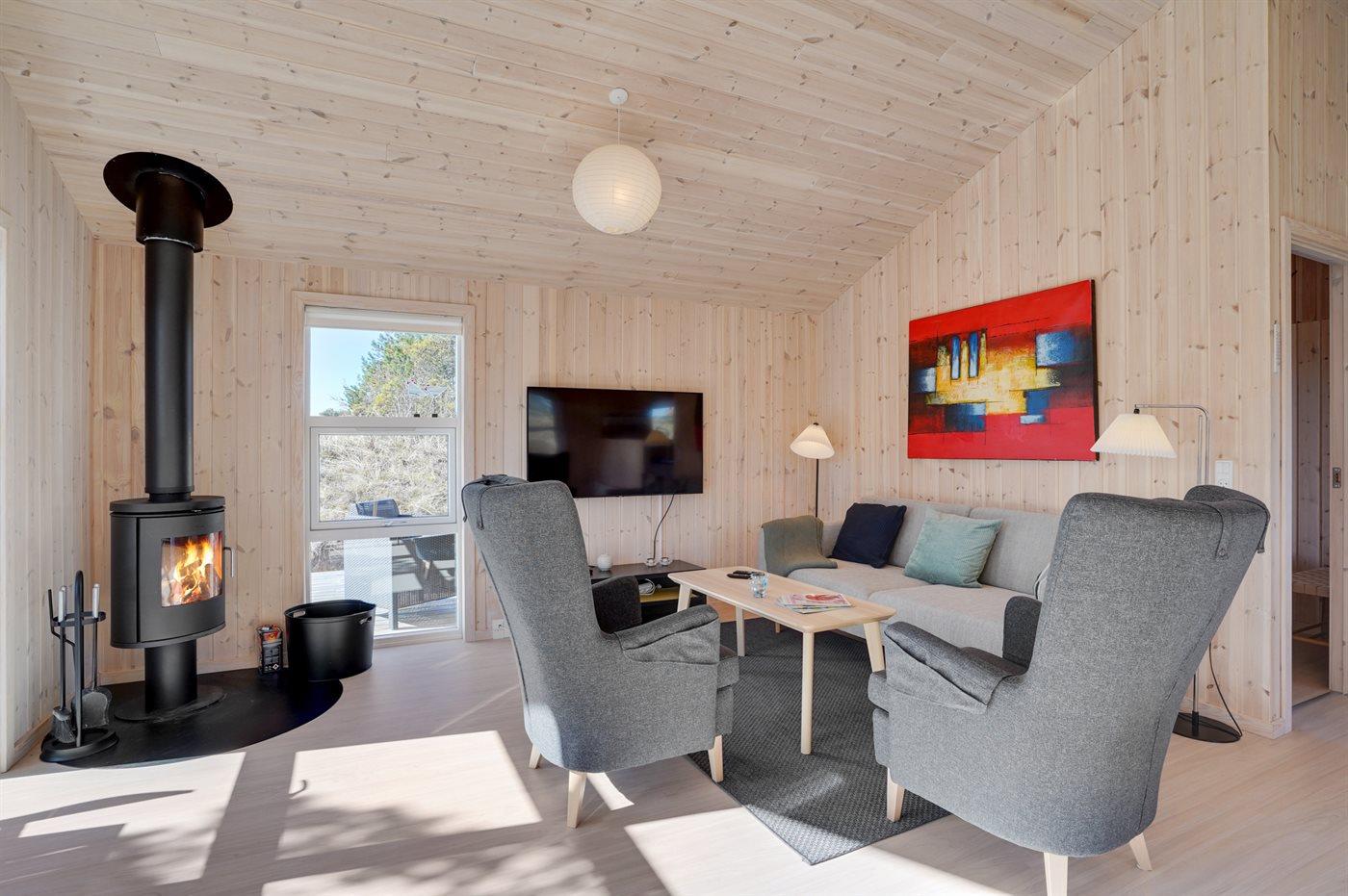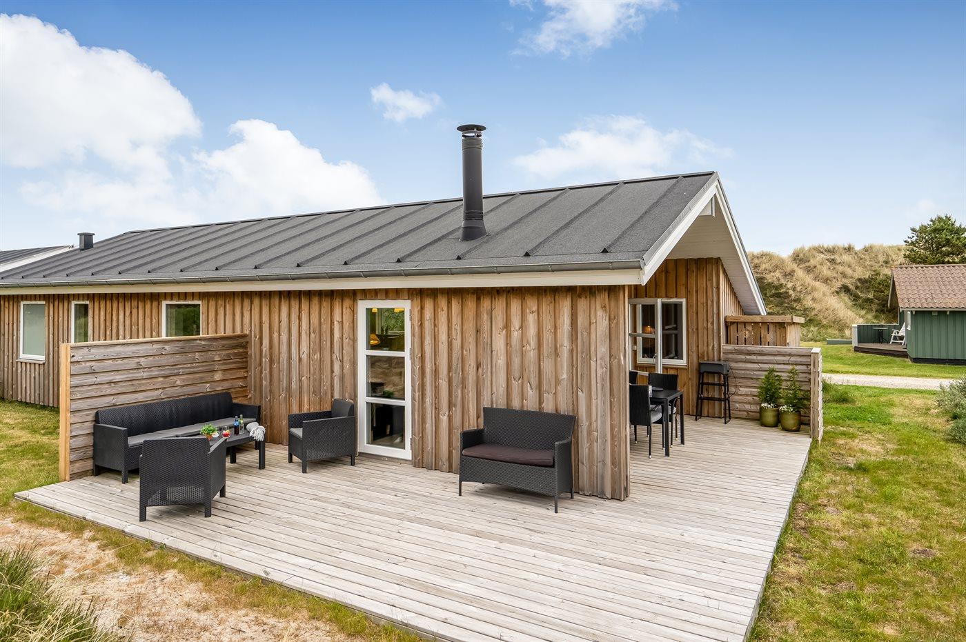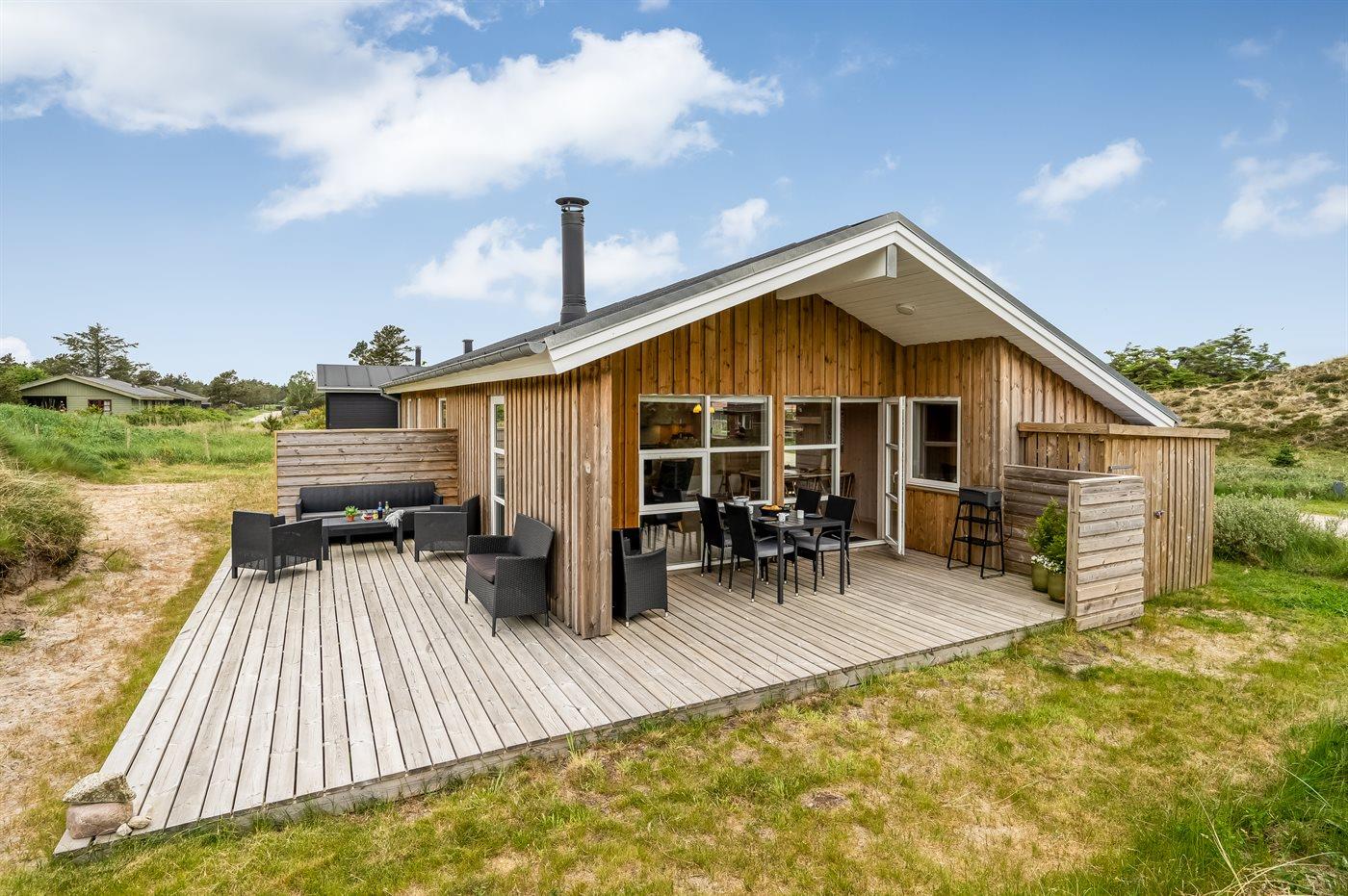 Nybygget sommerhus i Klitmøller med sauna, brændeovn og store terrasser nær havet og naturen.