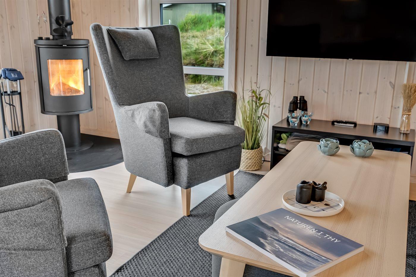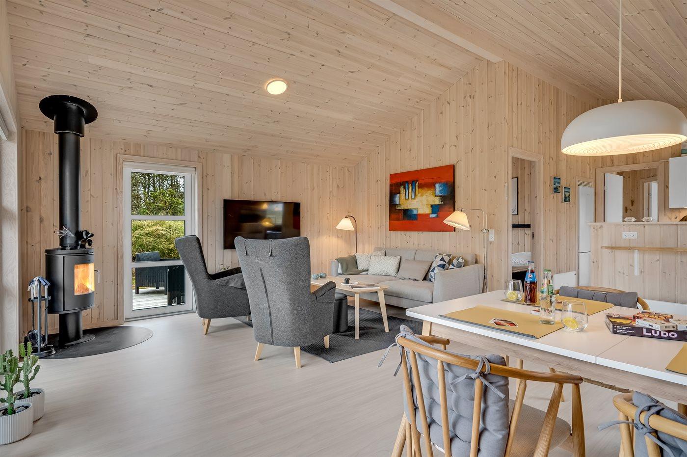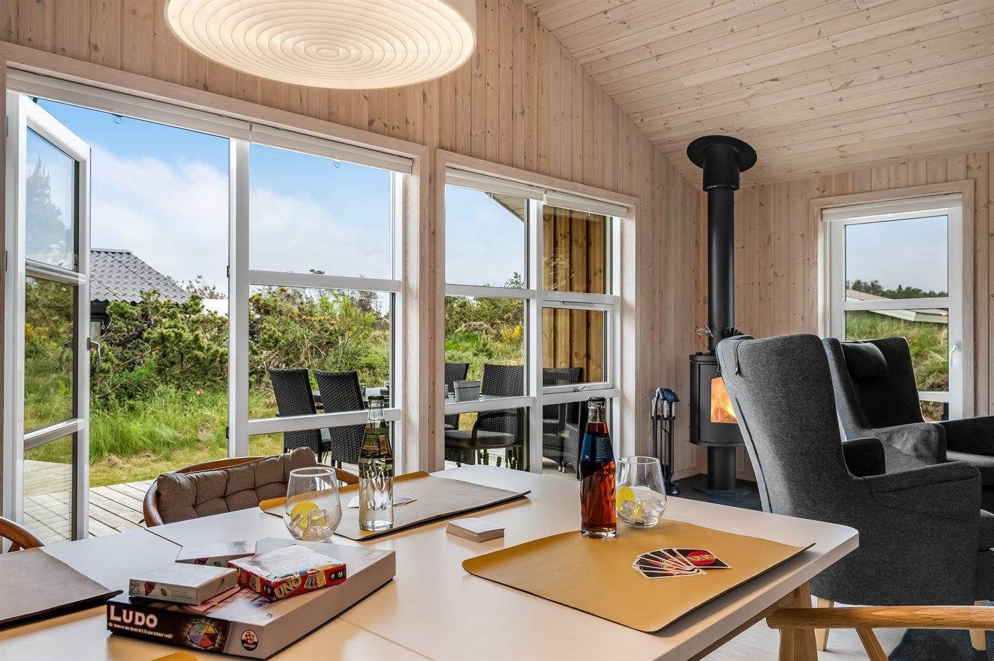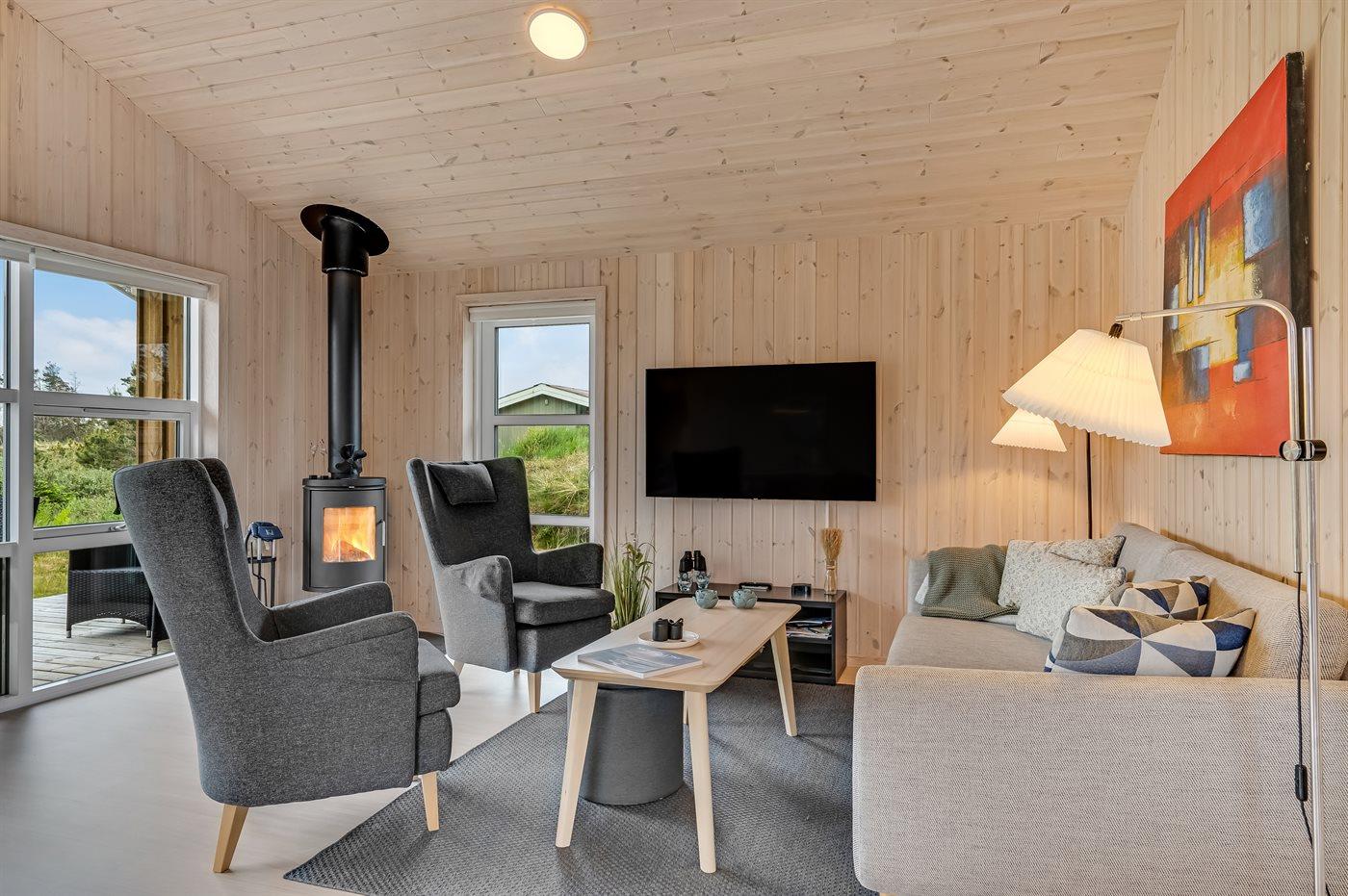 Nybygget sommerhus i Klitmøller med sauna, brændeovn og store terrasser nær havet og naturen.