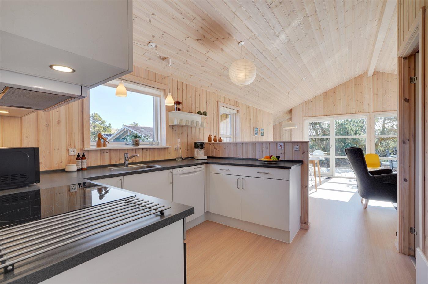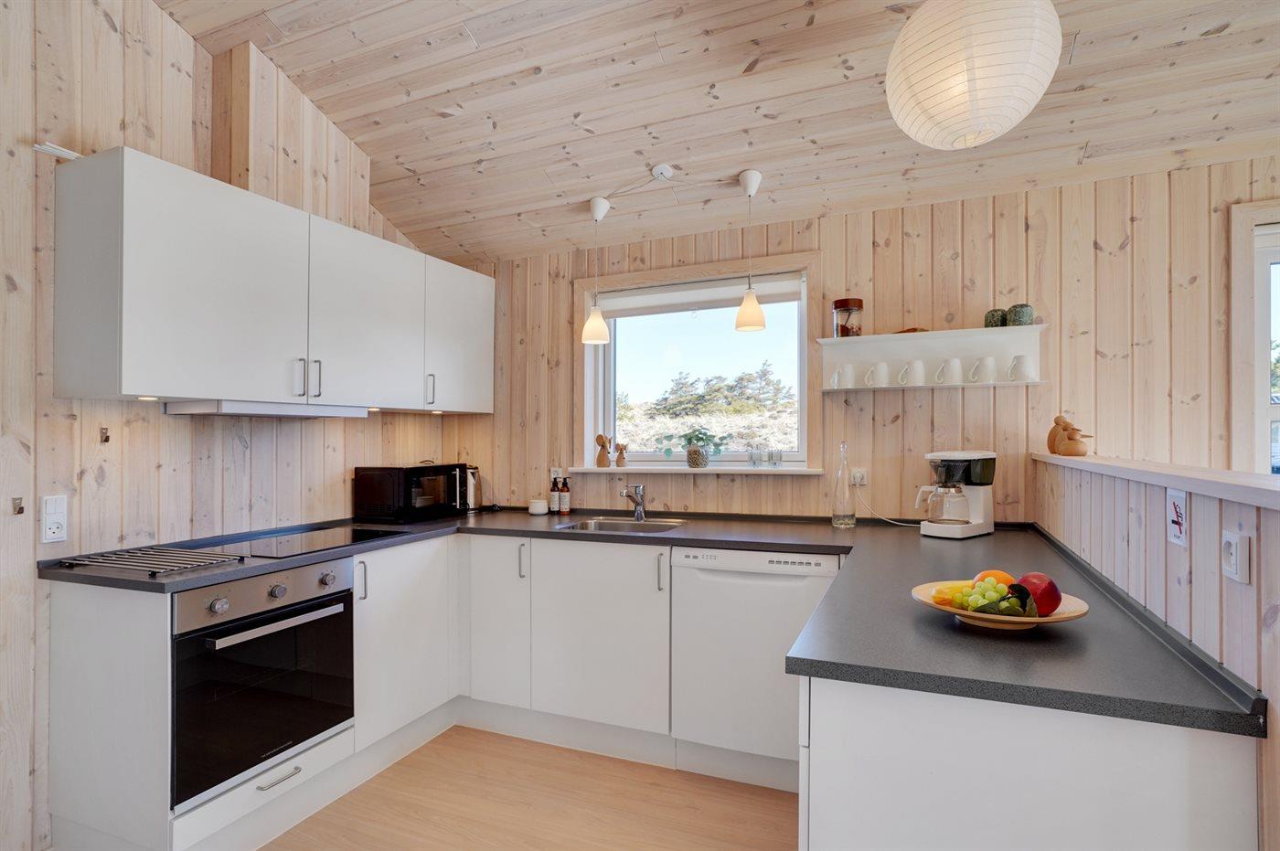 Køkkenet er udstyret med 1 køleskab. Der er 4 keramiske kogeplader, varmluftovn, mikrobølgeovn samt opvaskemaskine.