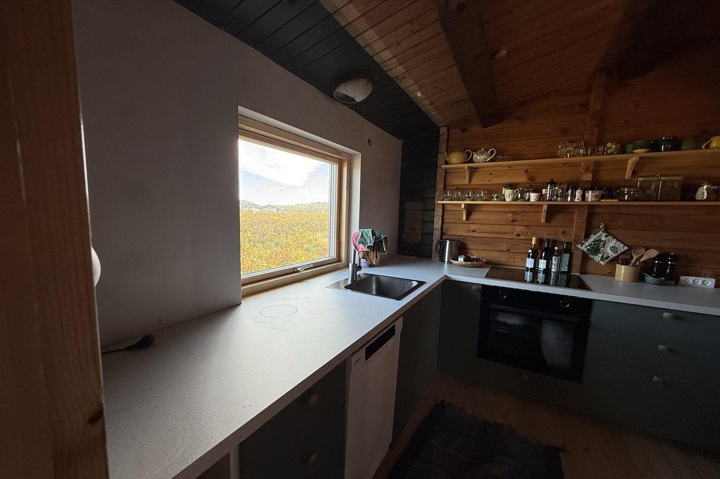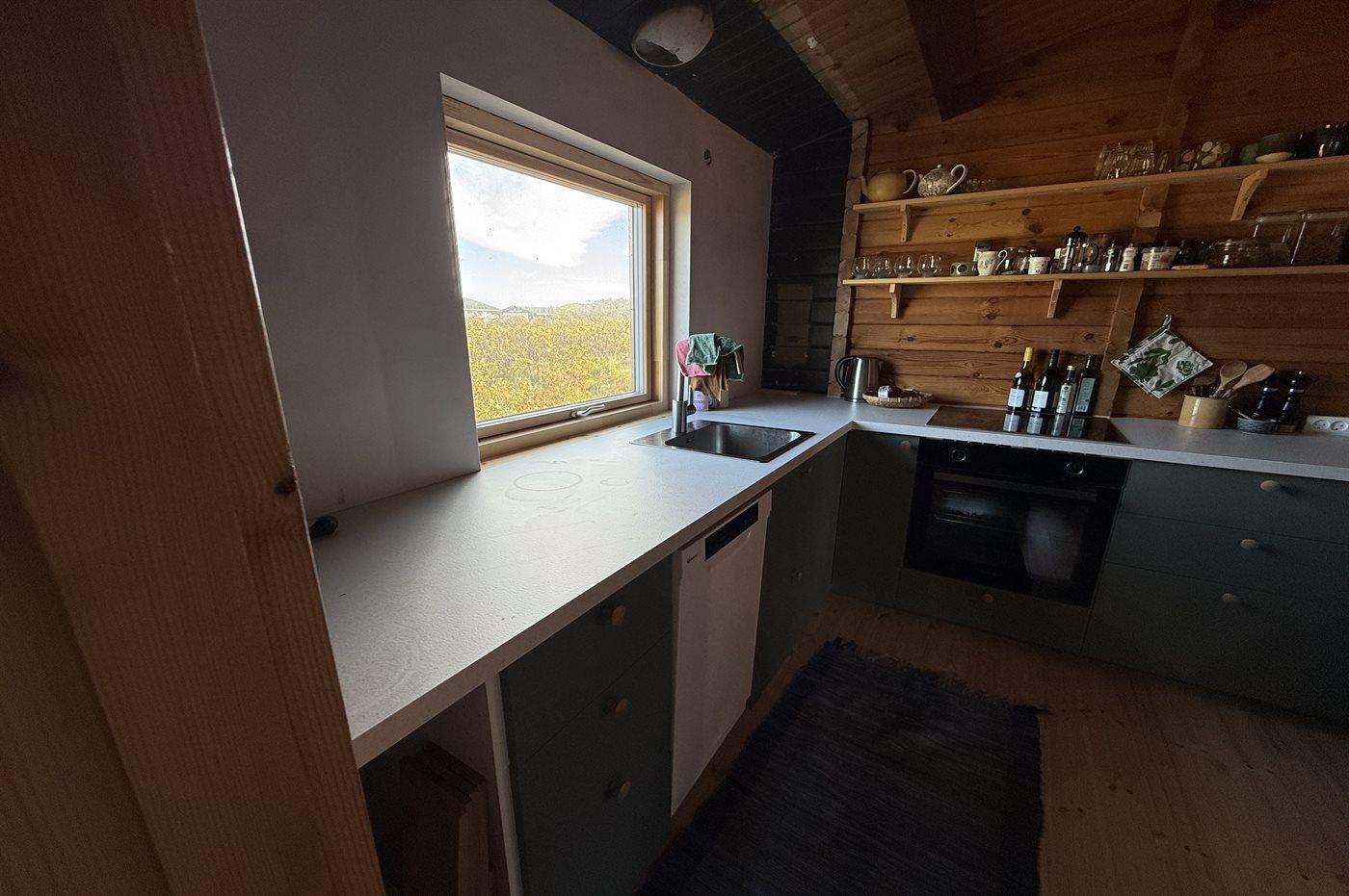Køkkenet er udstyret med 1 køleskab. Der er 4 keramiske kogeplader, varmluftovn samt opvaskemaskine.