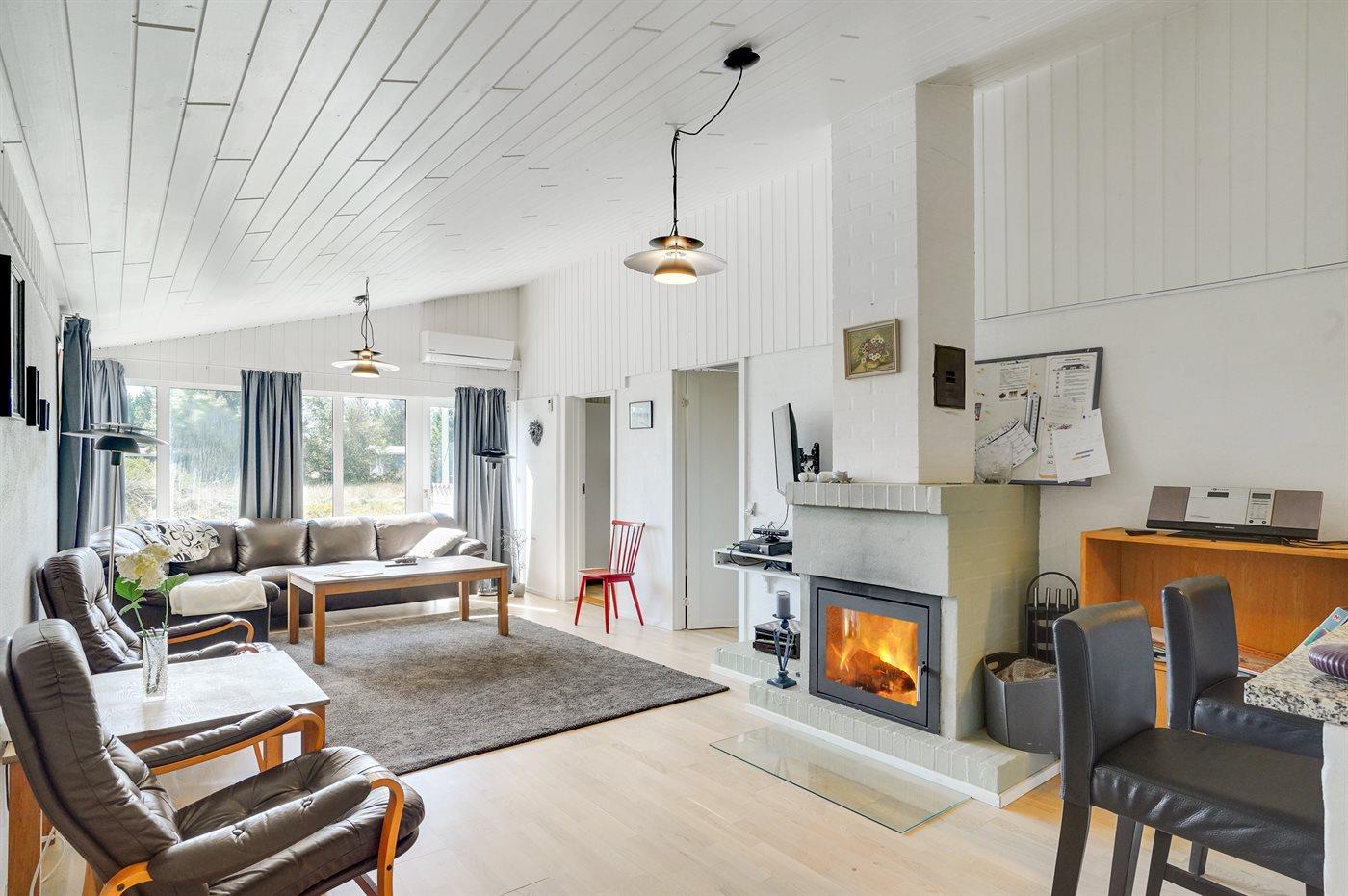 Dette sommerhus med swimmingpool ligger på en stor og delvist beplantet naturgrund i det populære ferieområde Klitmøller. Rundt om huset er der en ca. 40 m2 stor terrasse, som gør det muligt at nyde solen hele dagen igennem. Indvendigt er huset meget lyst og venligt indrettet og der findes hvidmalede vægge og lyse lofter. I den dejlige, sydvendte stue finder I en brændeovn til kølige stunder samt udgang til den store terrasse. I den pæne køkkenafdeling findes alt i tekniske hjælpemidler. Samlingspunktet i huset vil naturligvis være den store poolafdeling med swimmingpool, 2-pers. spa og adgang til sauna. Poolen opvarmes med en energivenlig varmepumpe og der er desuden gulvvarme i poolafdelingen. Sommerhusets størrelse og indretning gør det velegnet til flere familier. Der er kun 4 km til en 18-hullers golfbane.