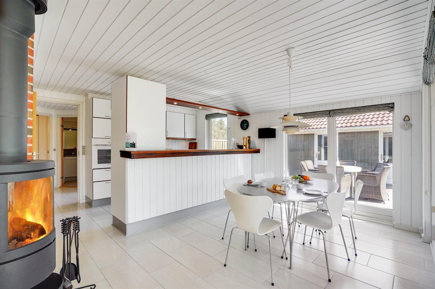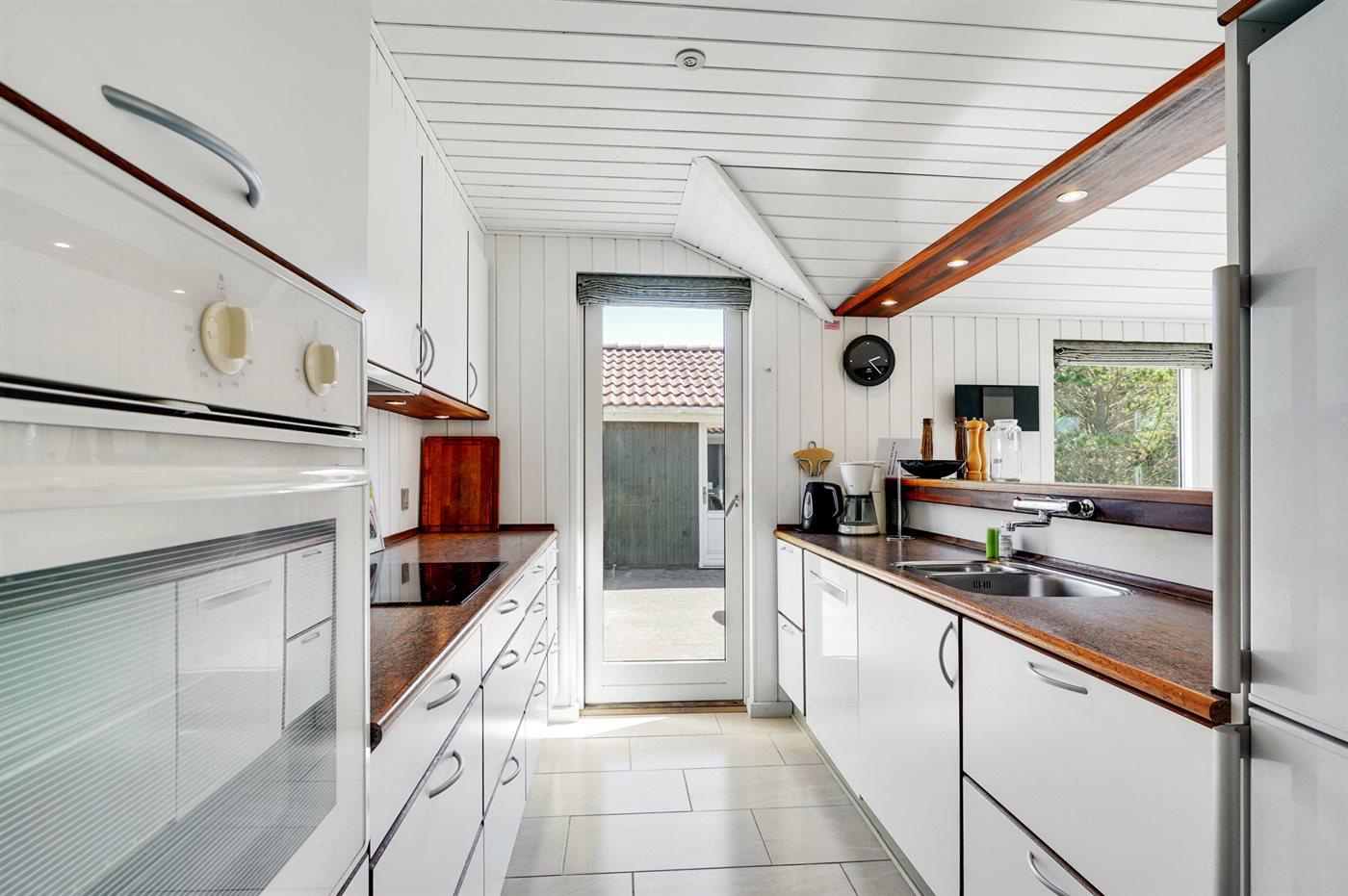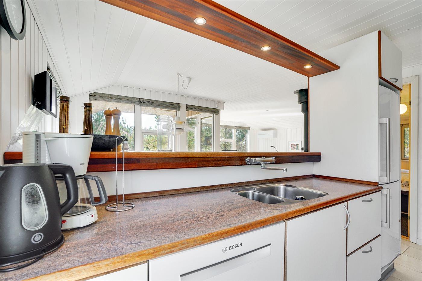 Køkkenet er udstyret med 1 køleskab. Der er 4 keramiske kogeplader, varmluftovn, mikrobølgeovn samt opvaskemaskine.