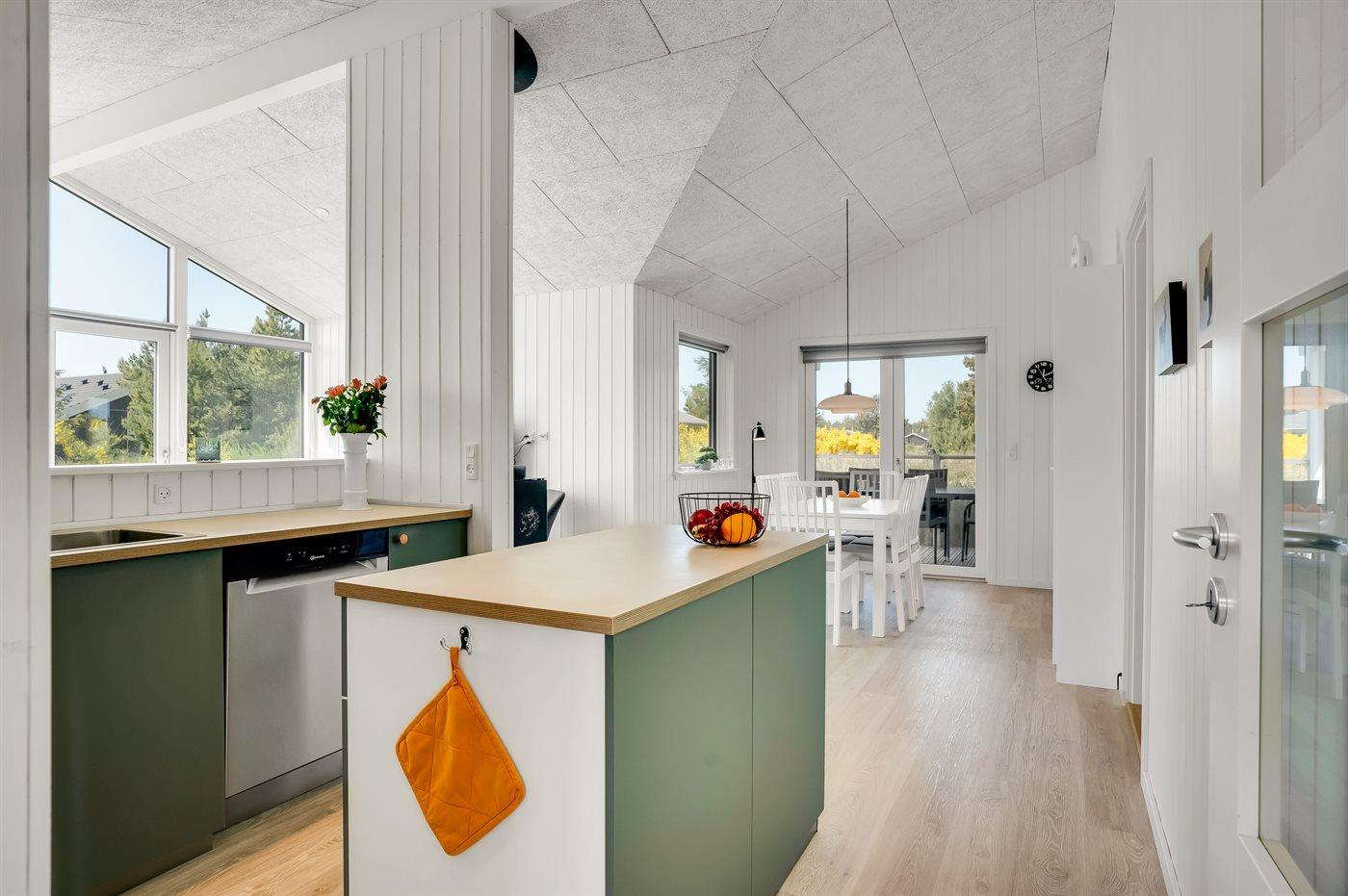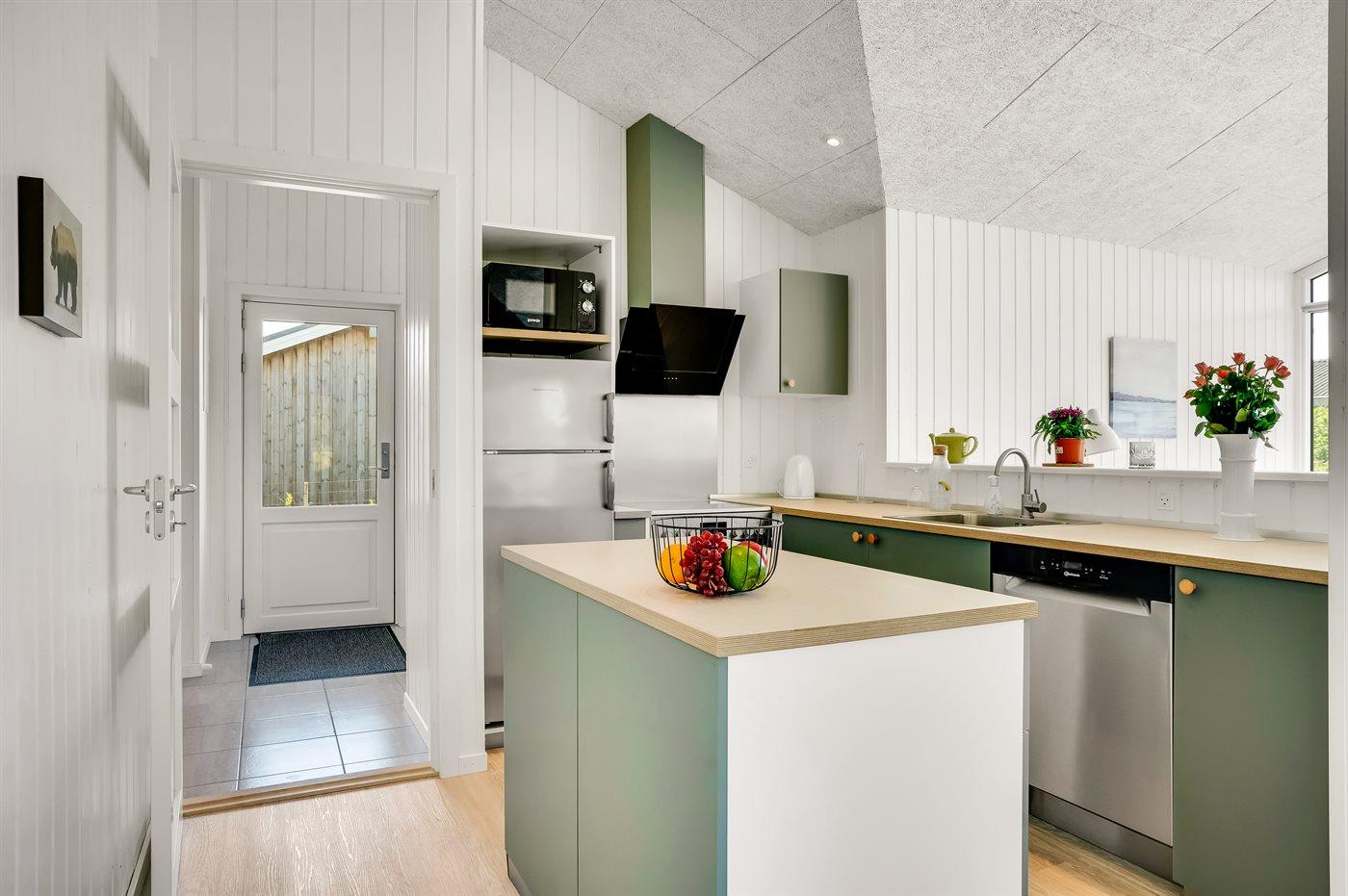 Køkkenet er udstyret med 1 køleskab. Der er 4 keramiske kogeplader, varmluftovn, mikrobølgeovn samt opvaskemaskine.