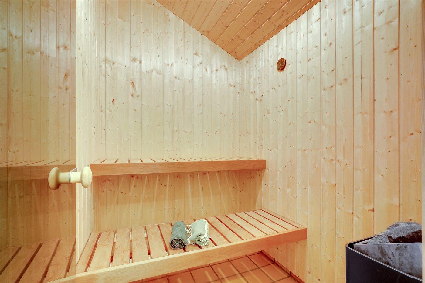 Der er 2 badeværelser med bruseniche og 2 toiletter. Der er gulvvarme på 2 badeværelser. I saunaen er der mulighed for afslapning.