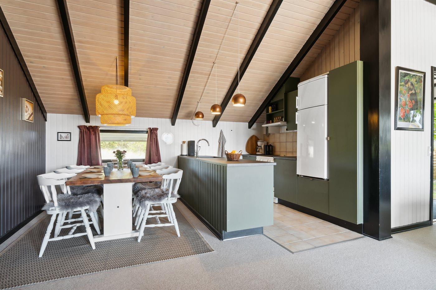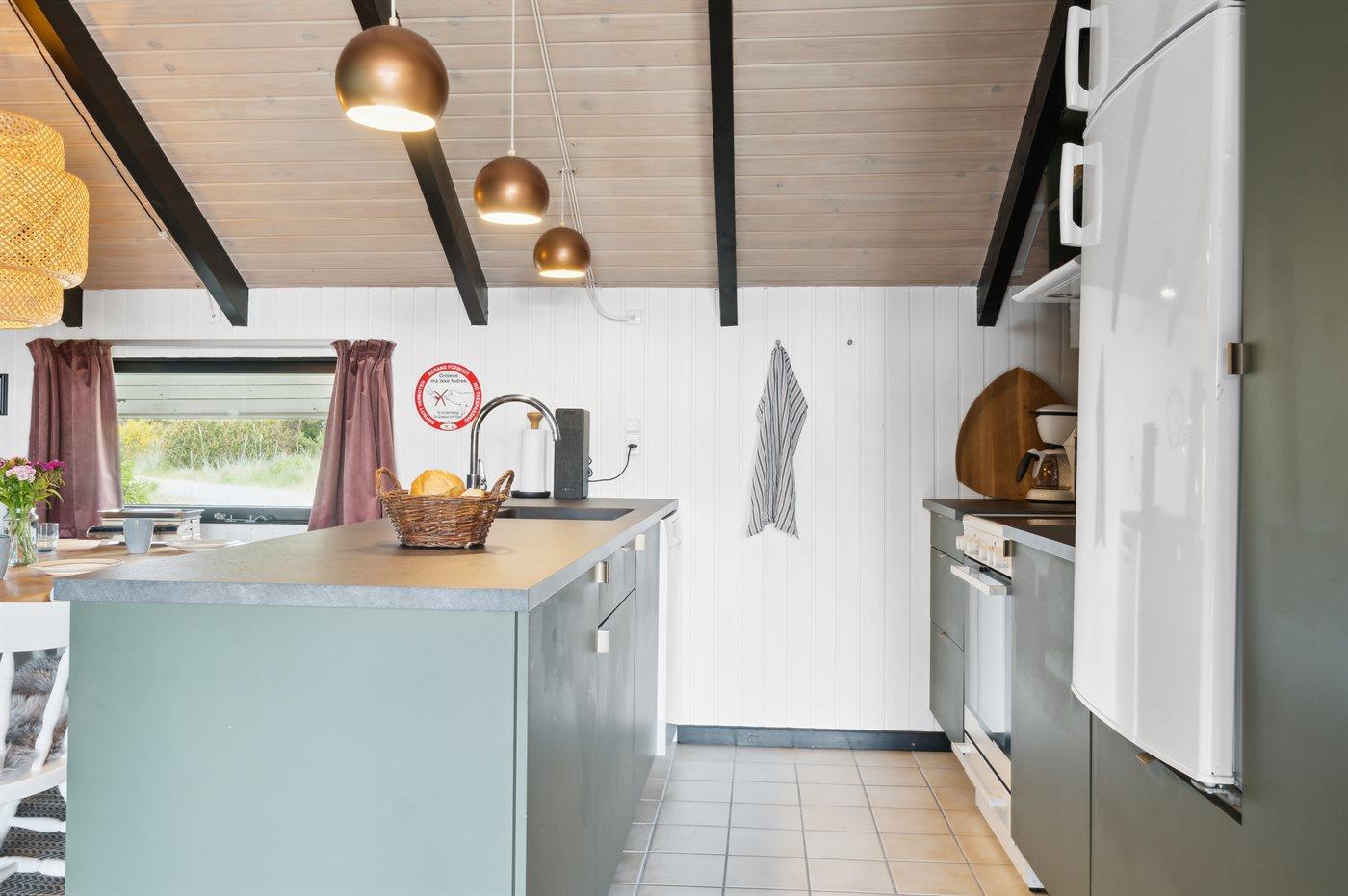Køkkenet er udstyret med 1 køleskab. Der er 4 keramiske kogeplader, varmluftovn samt opvaskemaskine.