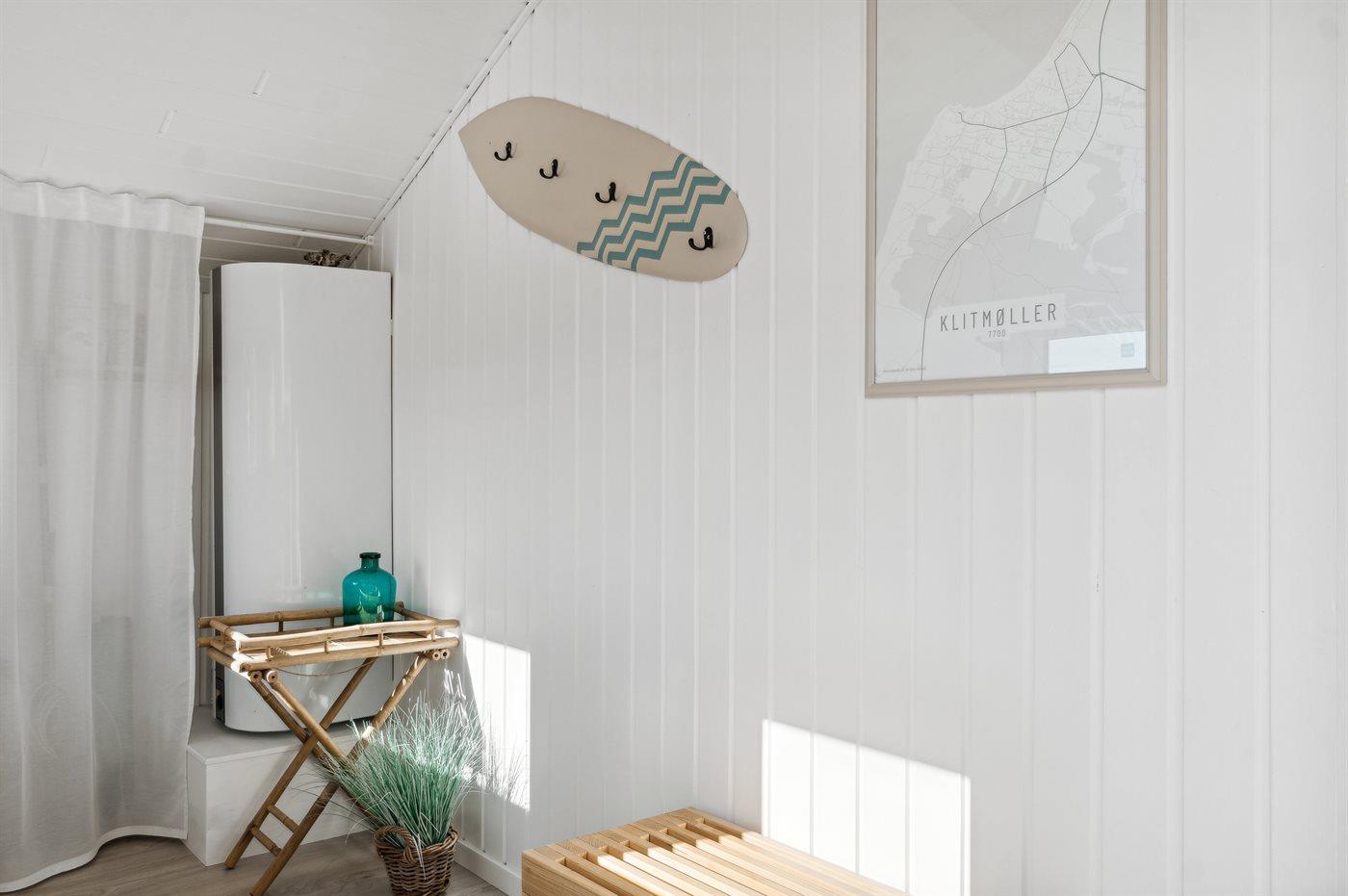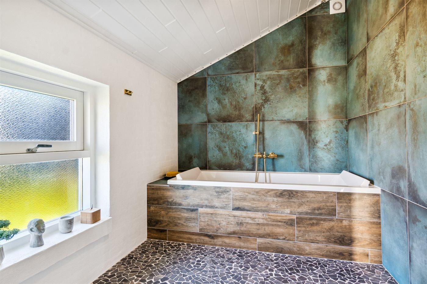 Der er 1 badeværelse med gulvvarme, bruseniche og toilet. Desuden findes der et rum med badekar. I saunaen er der mulighed for afslapning.