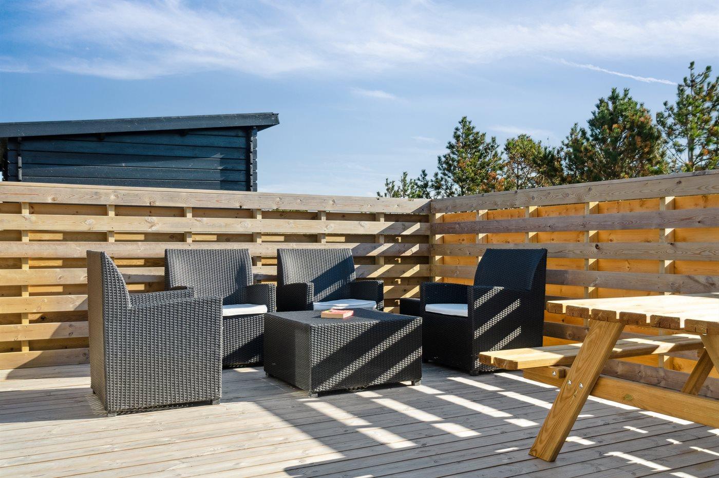 Rundt om huset findes en stor, delvis overdækket træterrasse, der giver ideelle betingelser for at nyde sommeren i det fri – her kan man altid finde sol eller skygge, og med fire dobbeltdøre, som fører ind til boligen, er terrassen en integreret del af boligen.