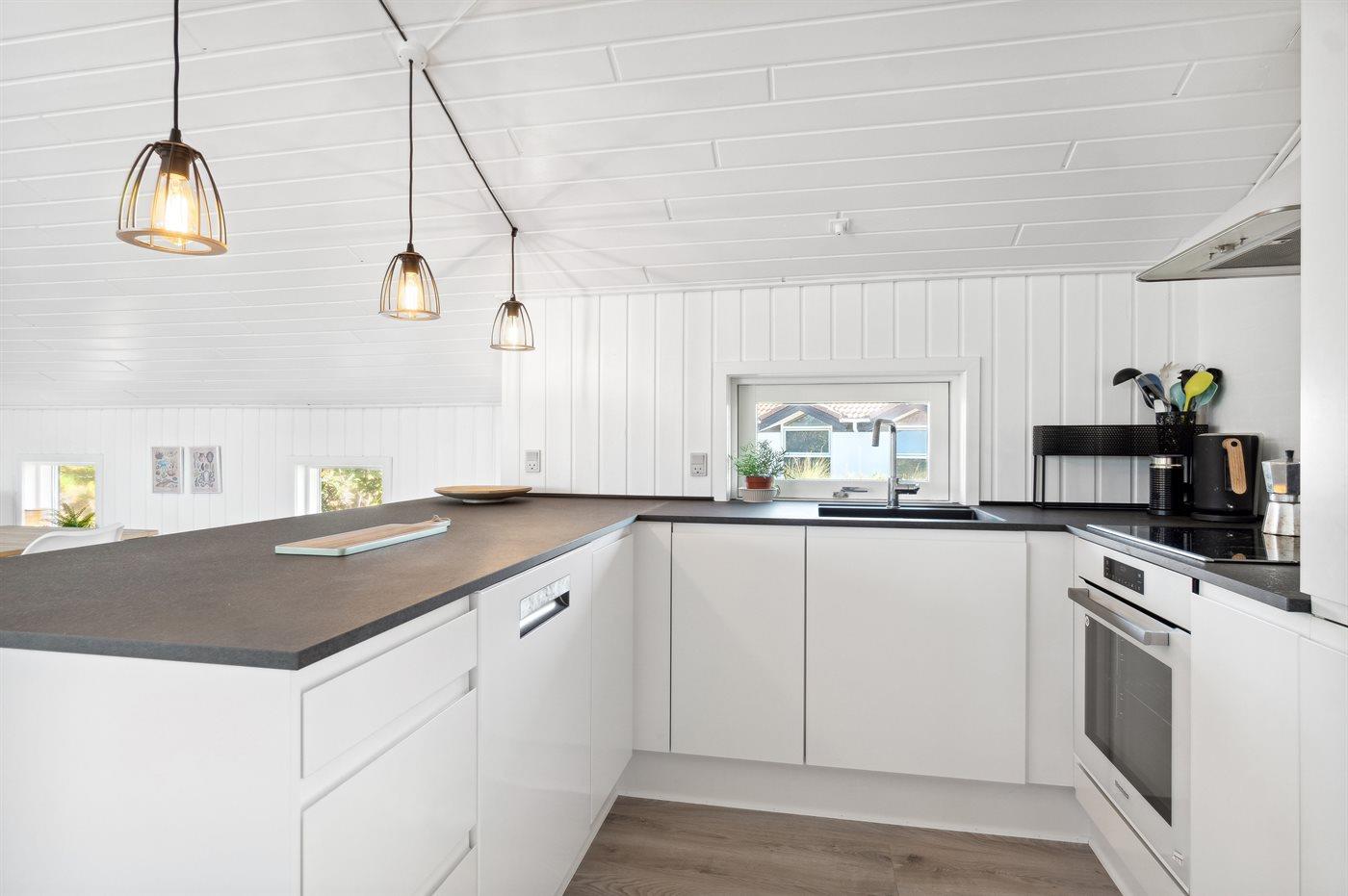 Køkkenet er udstyret med 1 køleskab. Der er 4 keramiske kogeplader, varmluftovn samt opvaskemaskine.