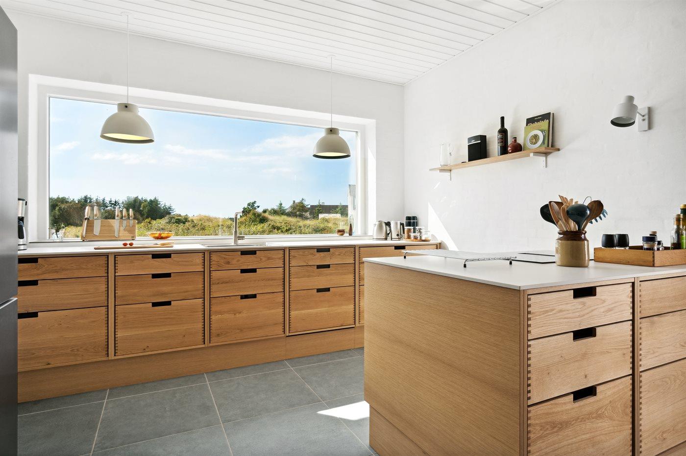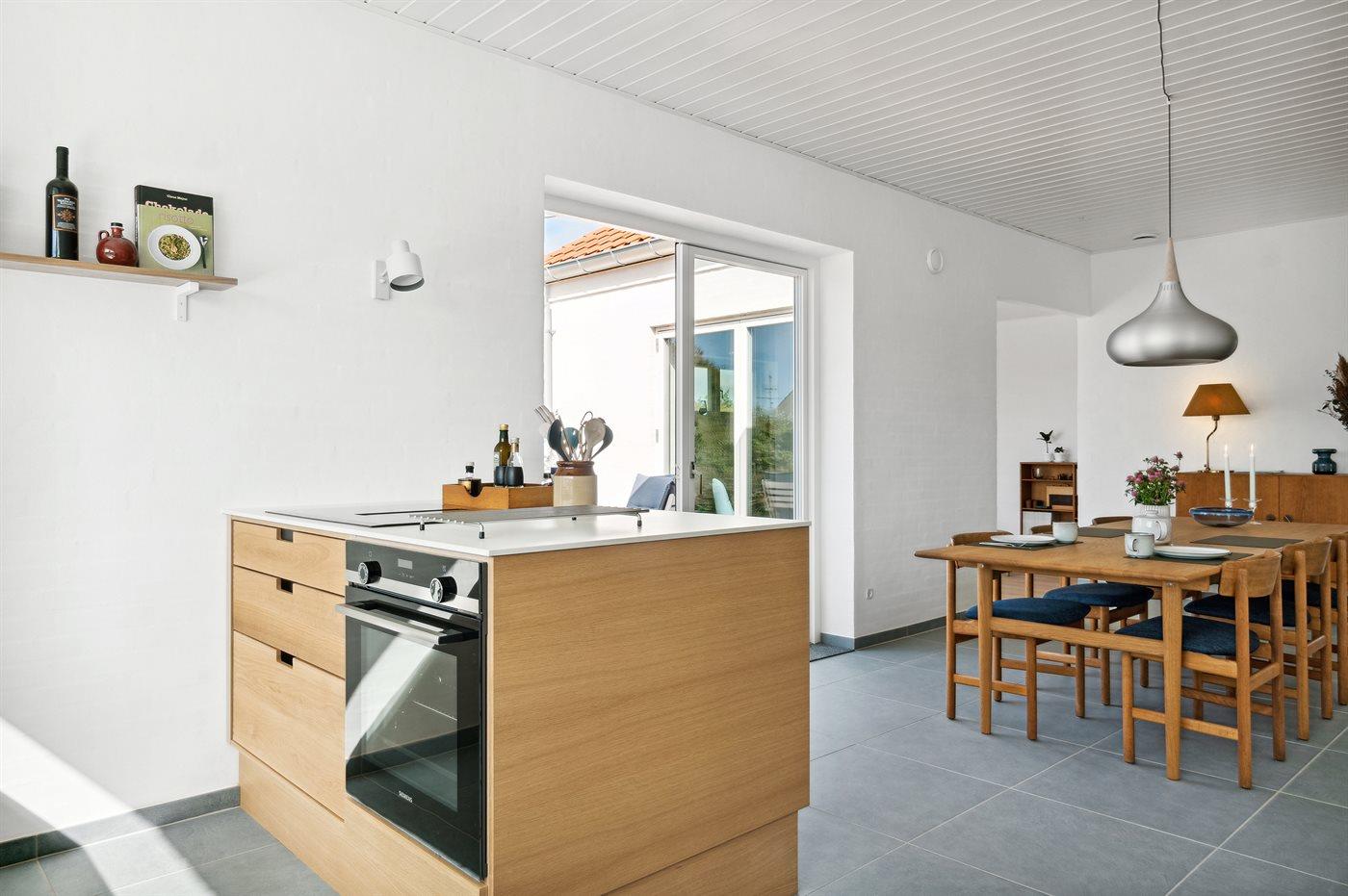 Køkkenet er udstyret med 1 køleskab. Der er 4 induktionskogeplader, varmluftovn samt opvaskemaskine.
