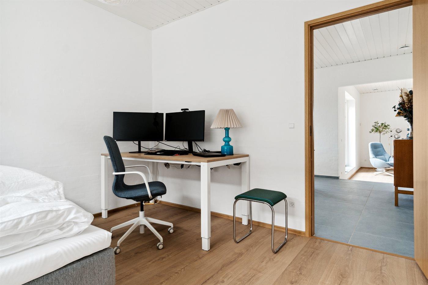 Sommerhuset har arbejdsplads med hæve/sænkebord, 2 skærme og dockingstation.