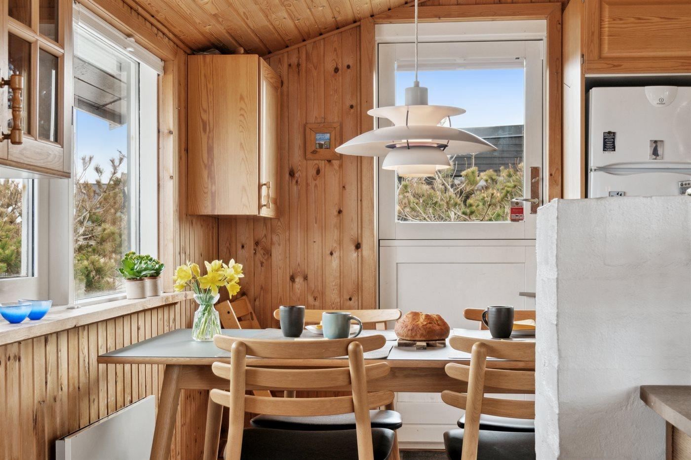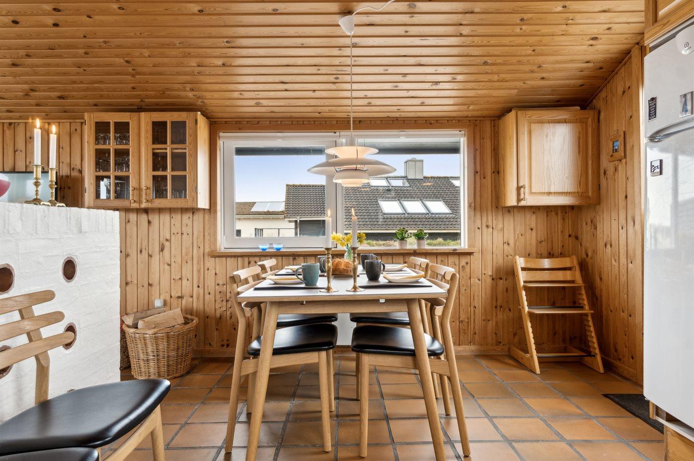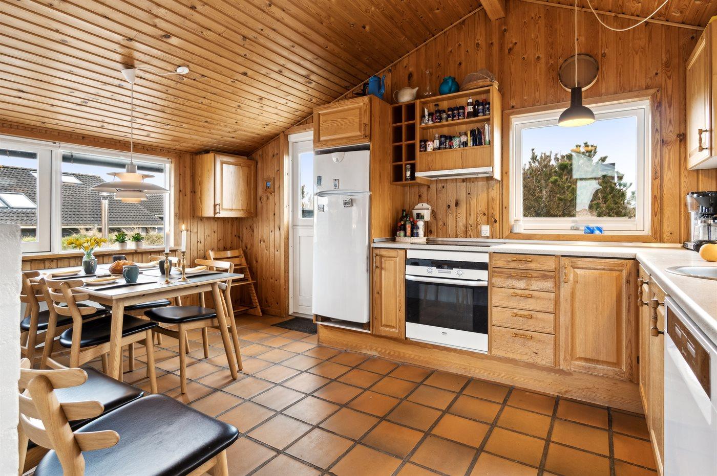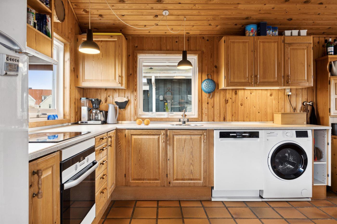 Køkkenet er udstyret med 1 køleskab. Der er 4 keramiske kogeplader, varmluftovn samt opvaskemaskine.