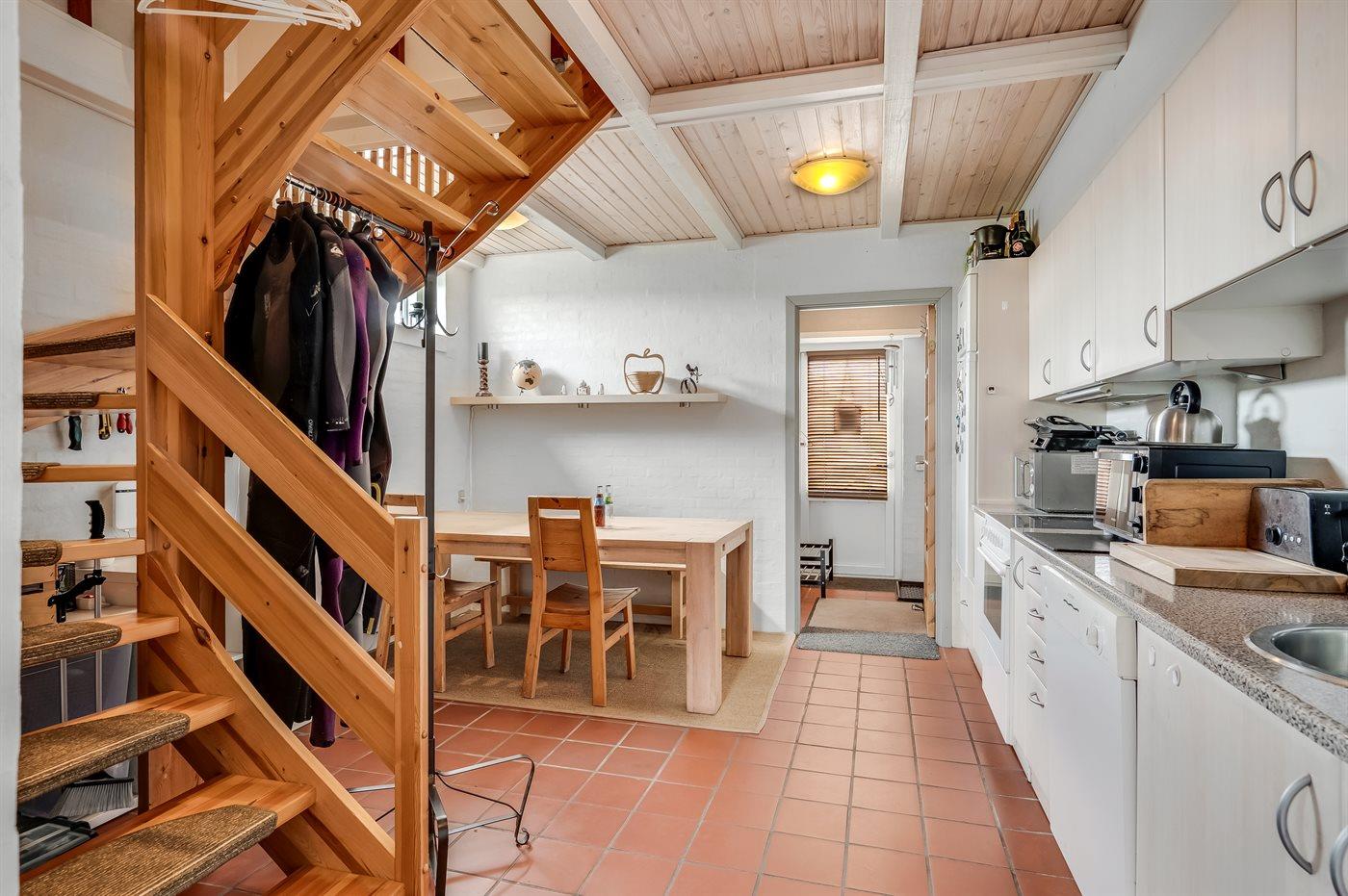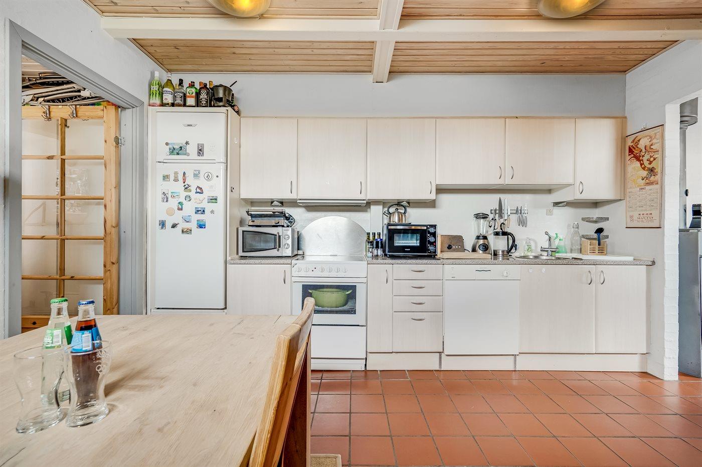 Køkkenet er udstyret med 1 køleskab. Der er 4 keramiske kogeplader, miniovn, varmluftovn, mikrobølgeovn samt opvaskemaskine.