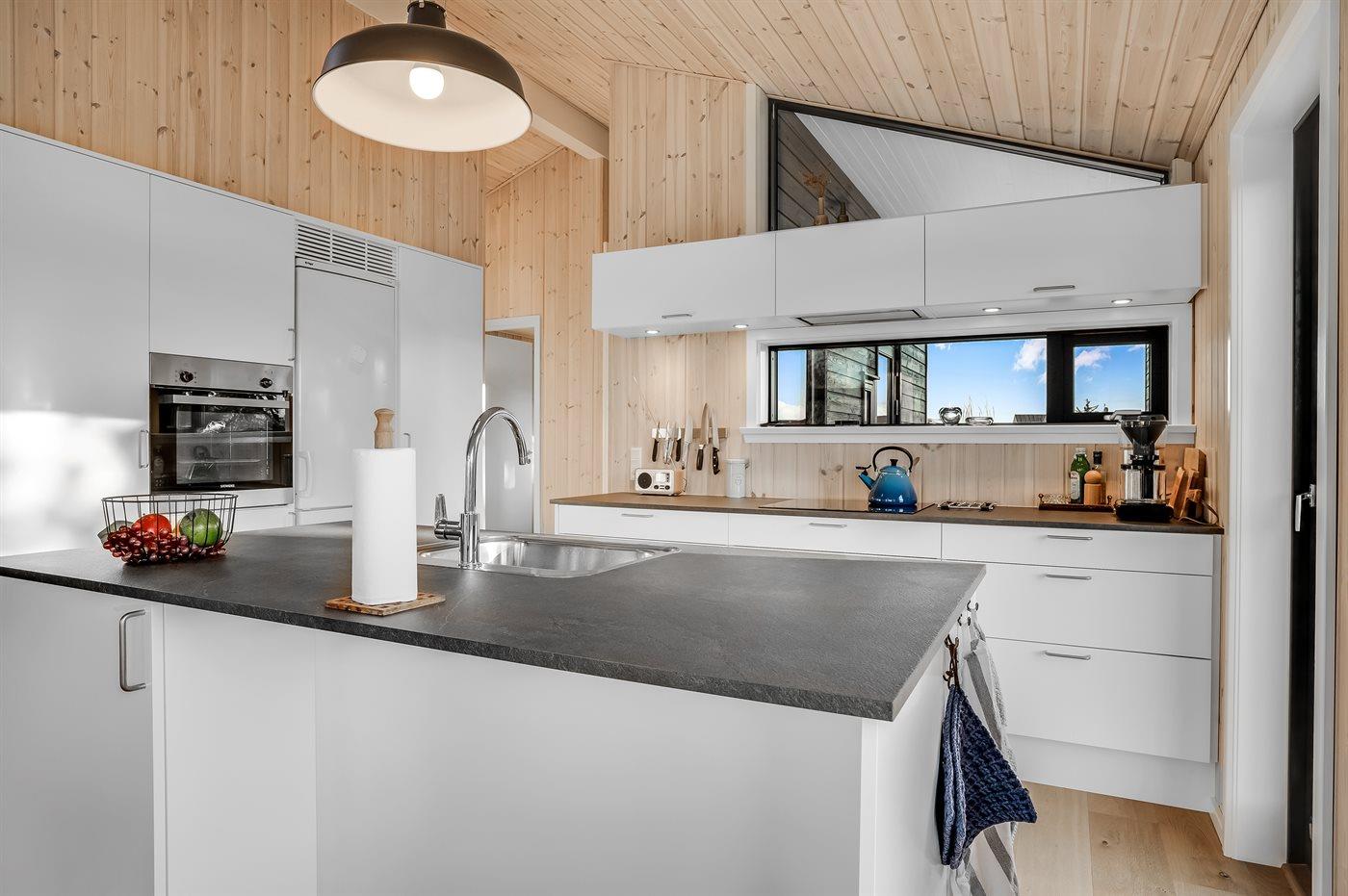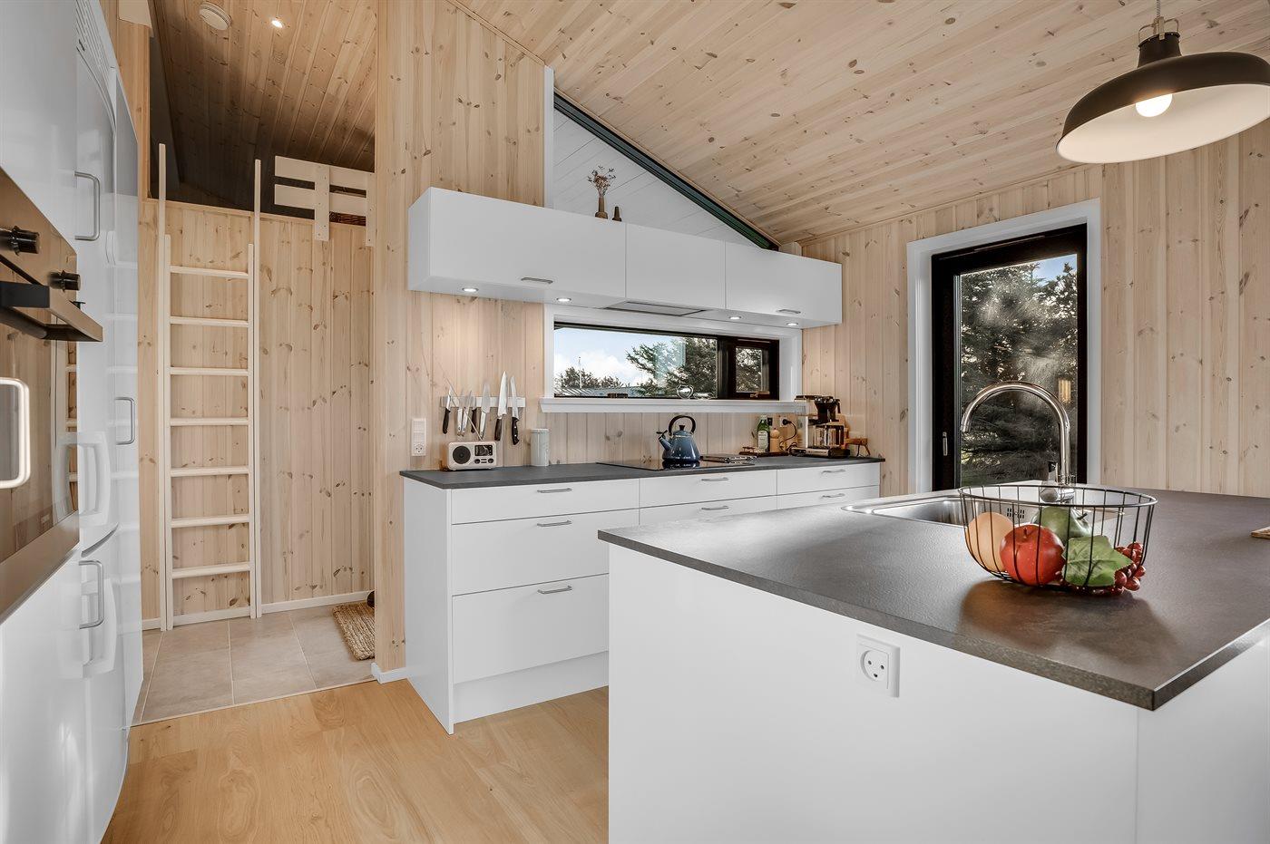 Køkkenet er udstyret med 1 køleskab. Der er 4 keramiske kogeplader, varmluftovn samt opvaskemaskine.