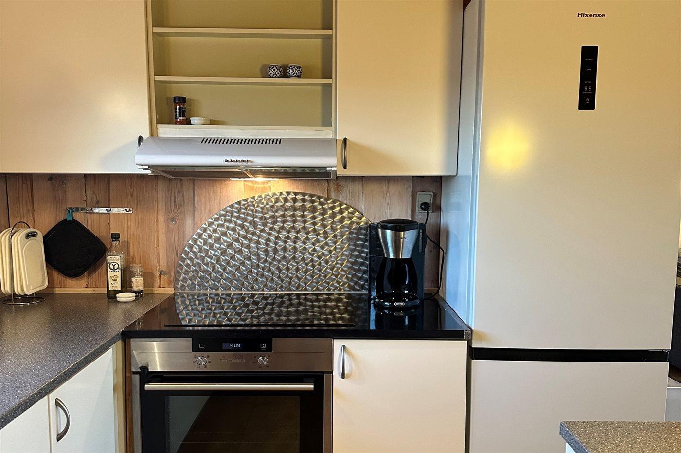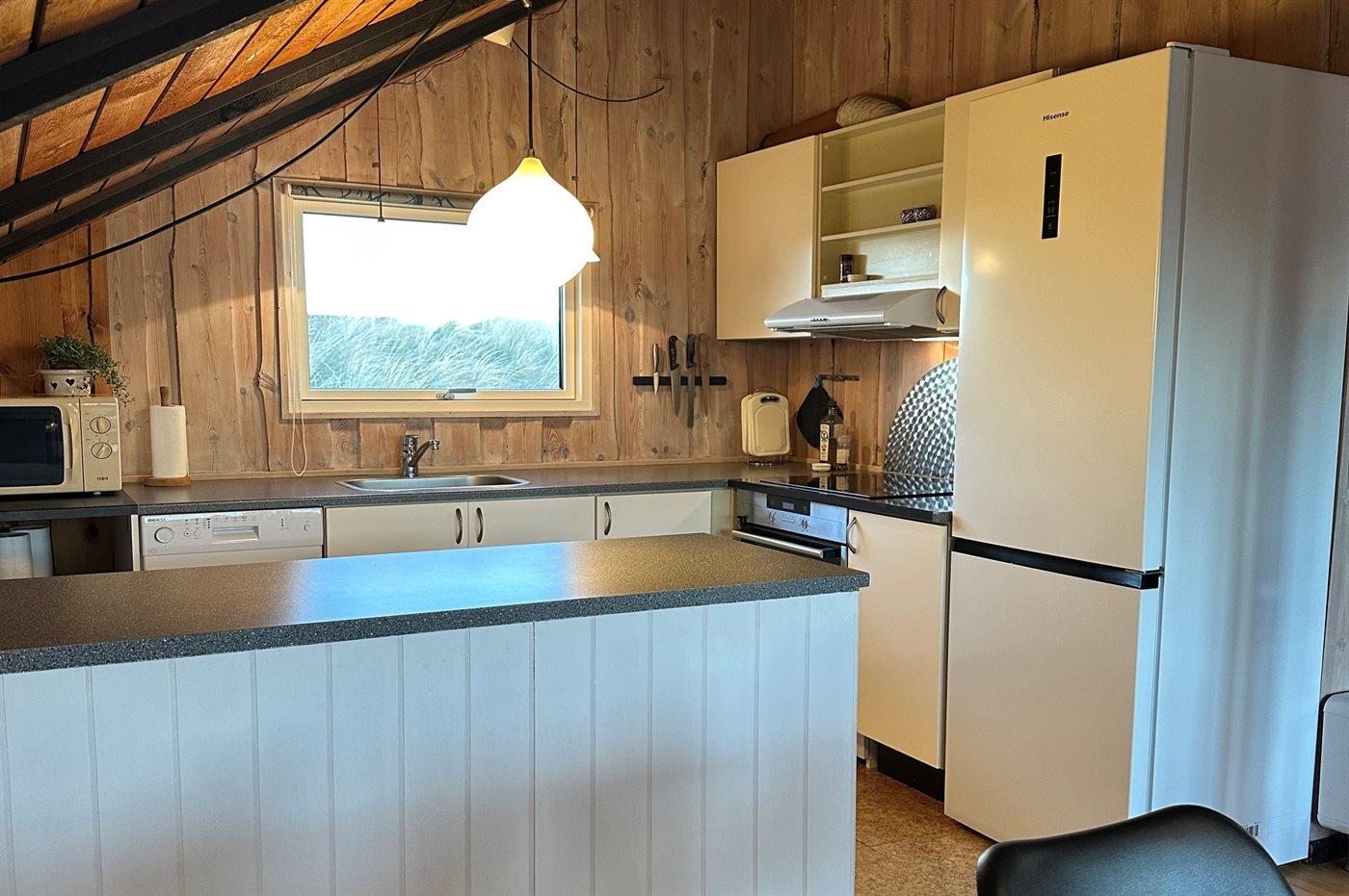 Køkkenet er udstyret med 1 køleskab. Der er 4 keramiske kogeplader, mikrobølgeovn, Airfryer samt opvaskemaskine.