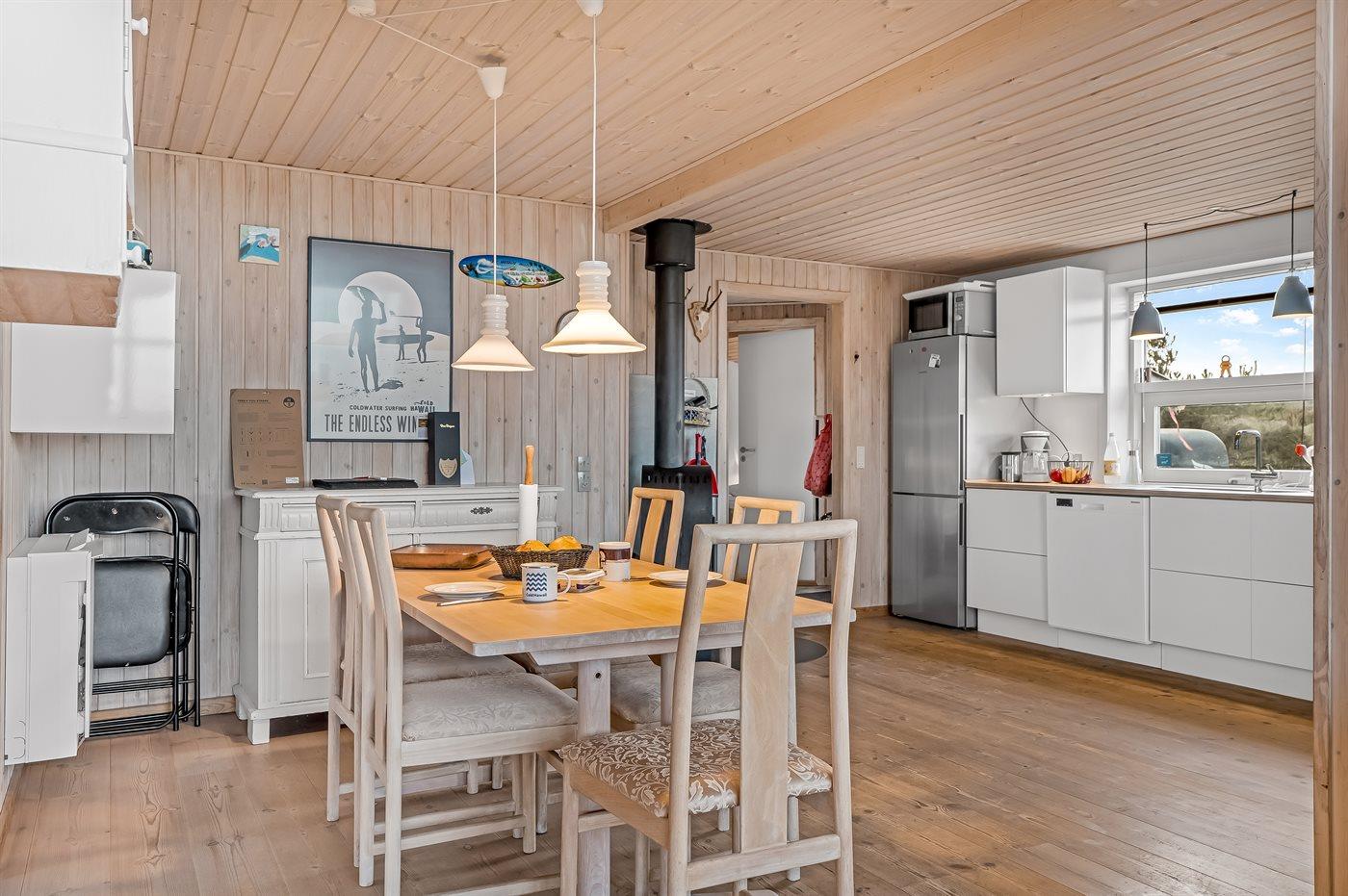Køkkenet er udstyret med 1 køleskab. Der er 4 elkogeplader, varmluftovn, mikrobølgeovn samt opvaskemaskine.