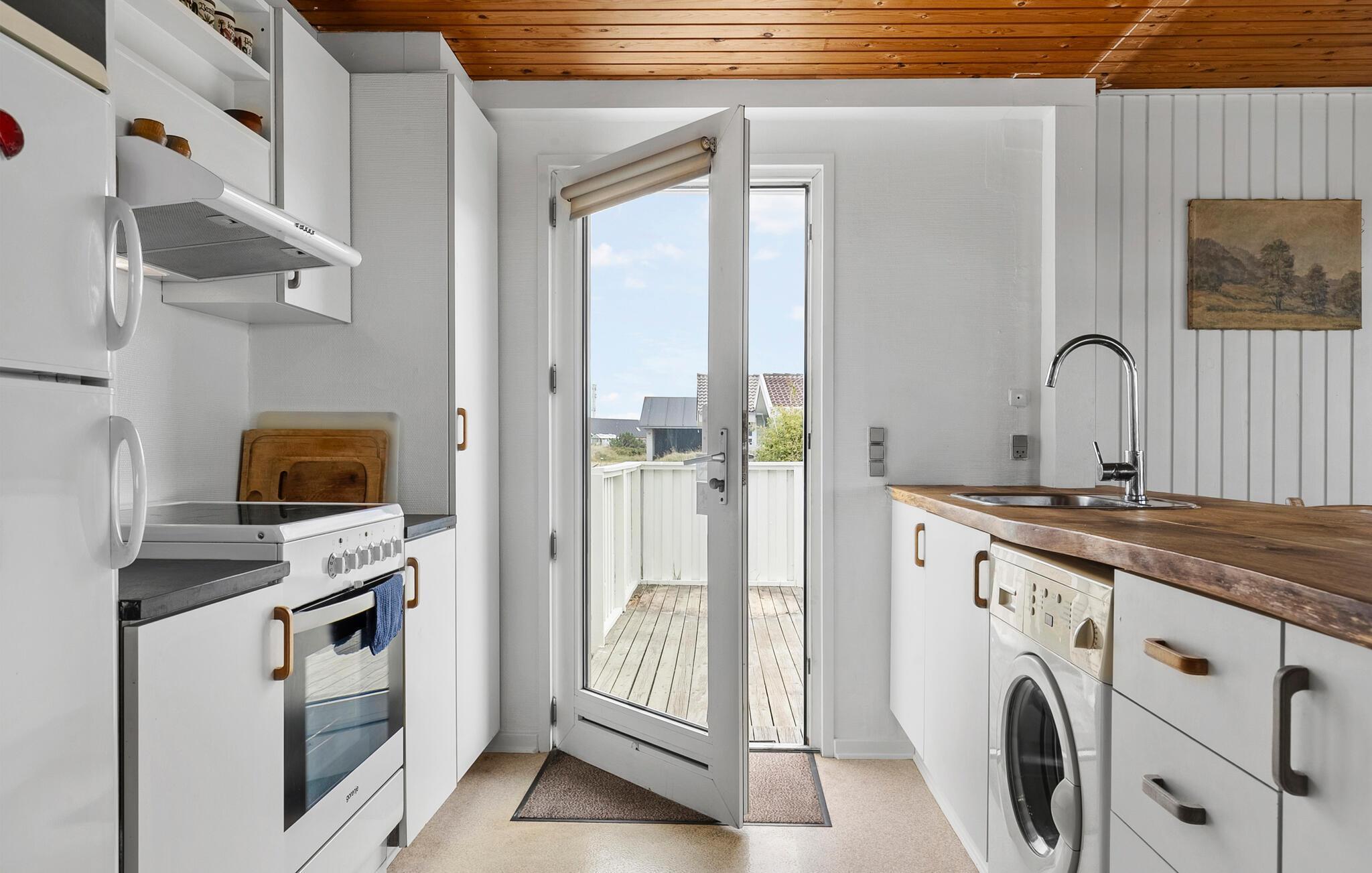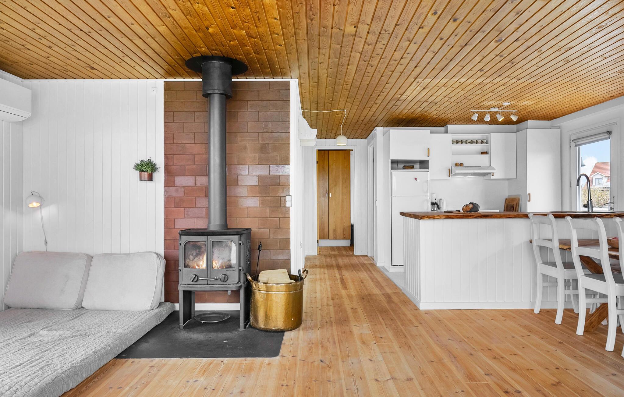 Træd ind i den lyse opholdsstue med store glasdøre, der lukker masser af lys ind og giver direkte adgang til terrassen. Hyg jer sammen på sofaen, eller nyd varmen fra brændeovnen på køligere dage. Den åbne spisestue går direkte over i køkkenet, som byder på god plads til at lave mad sammen.