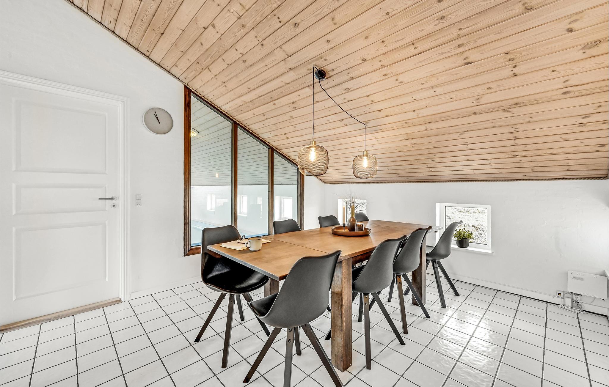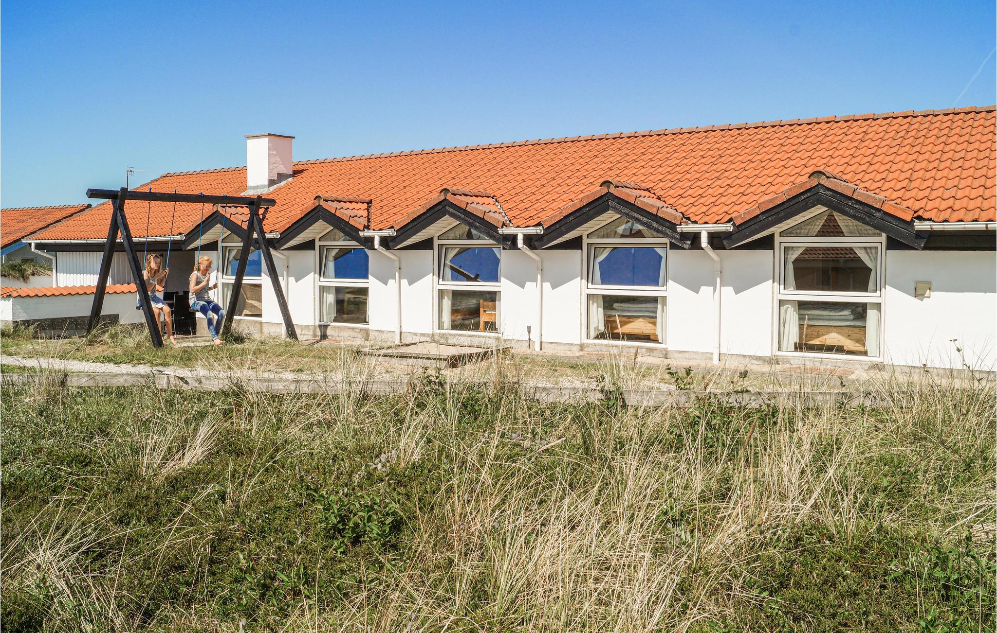 Ikke langt fra den hvide sandstrand i Klitmøller ligger dette dejlige feriehus. Her finder I alle de faciliteter, der danner rammen om en skøn ferie for to-tre familier. Den dejlige sydvendte stue er forsynet med gedigne møbler. Køkkenet er veludstyret og der er god skabsplads. I poolrummet, hvor gulvene naturligvis er opvarmede, er der foruden swimmingpool med vandrutsjebane også børnepool, spabad og badeværelse med adgang til sauna. De mindste kan også hygge sig med de udendørs legeredskaber. Den sydvendte terrasse er omgivet af en mur, der giver god læ. Her kan store som små tilbringe mange timer med solbadning, leg og hygge. Fra huset er der ikke langt til aktiviteter som minigolf, tennis- og golfbane.
