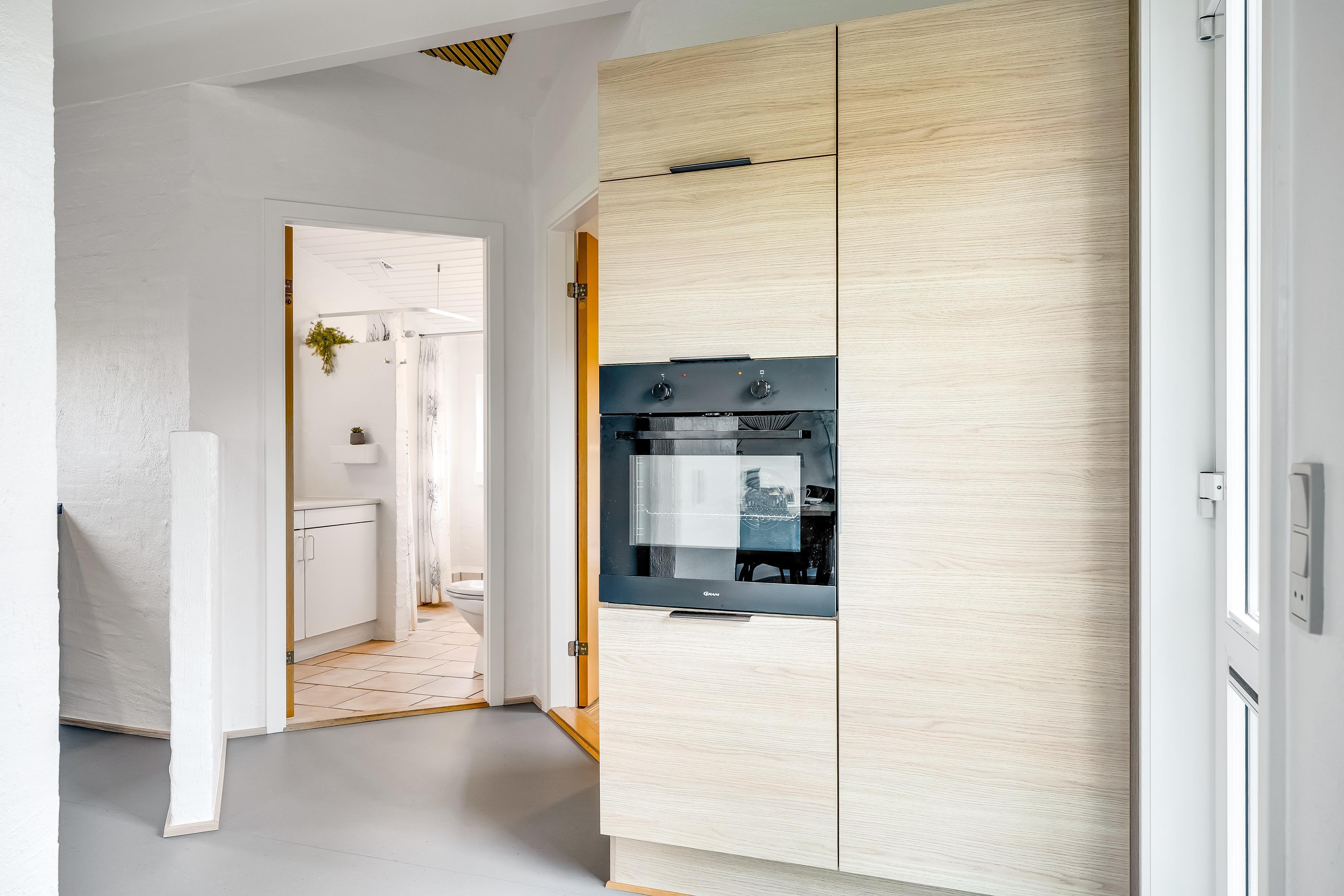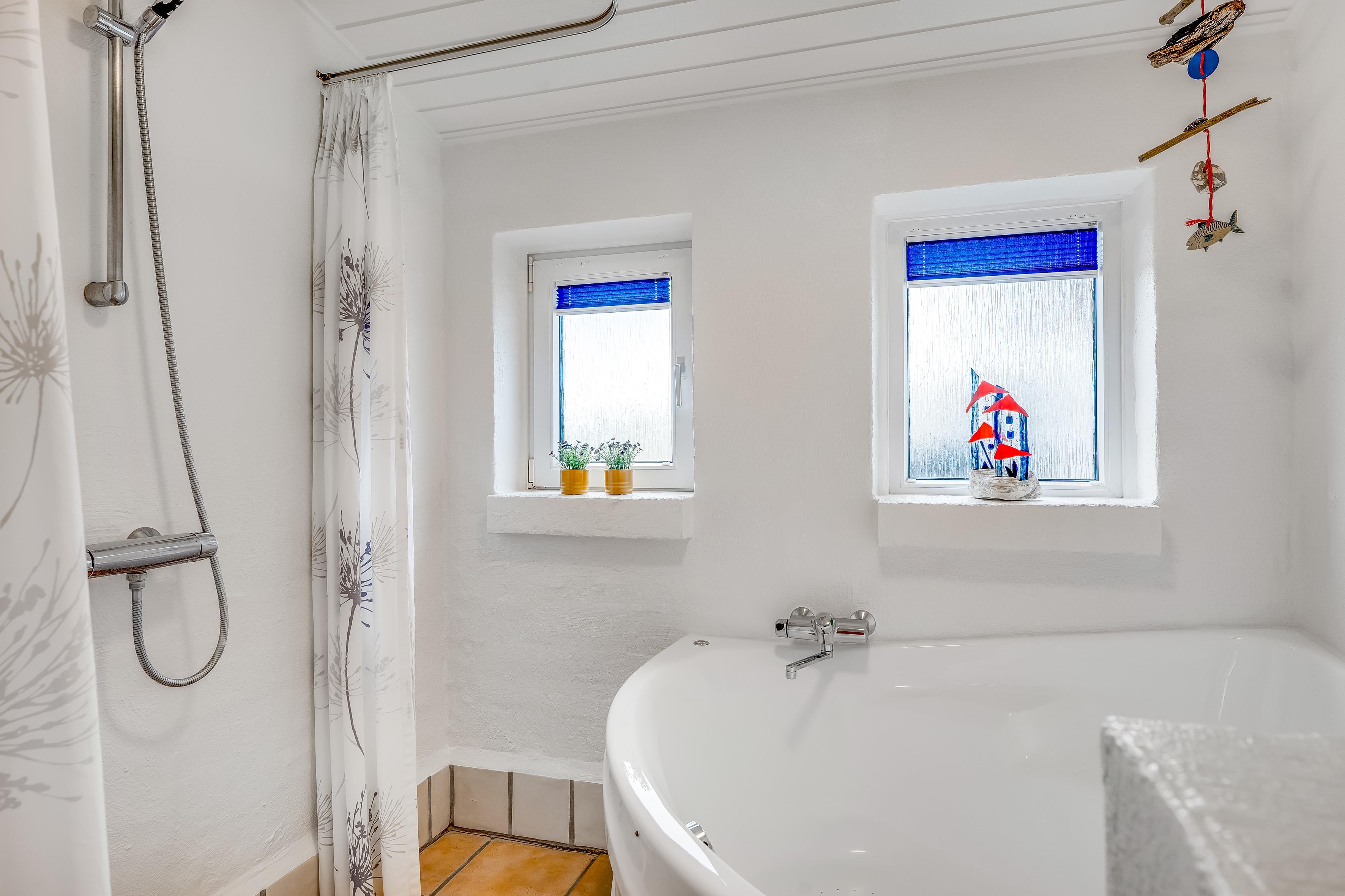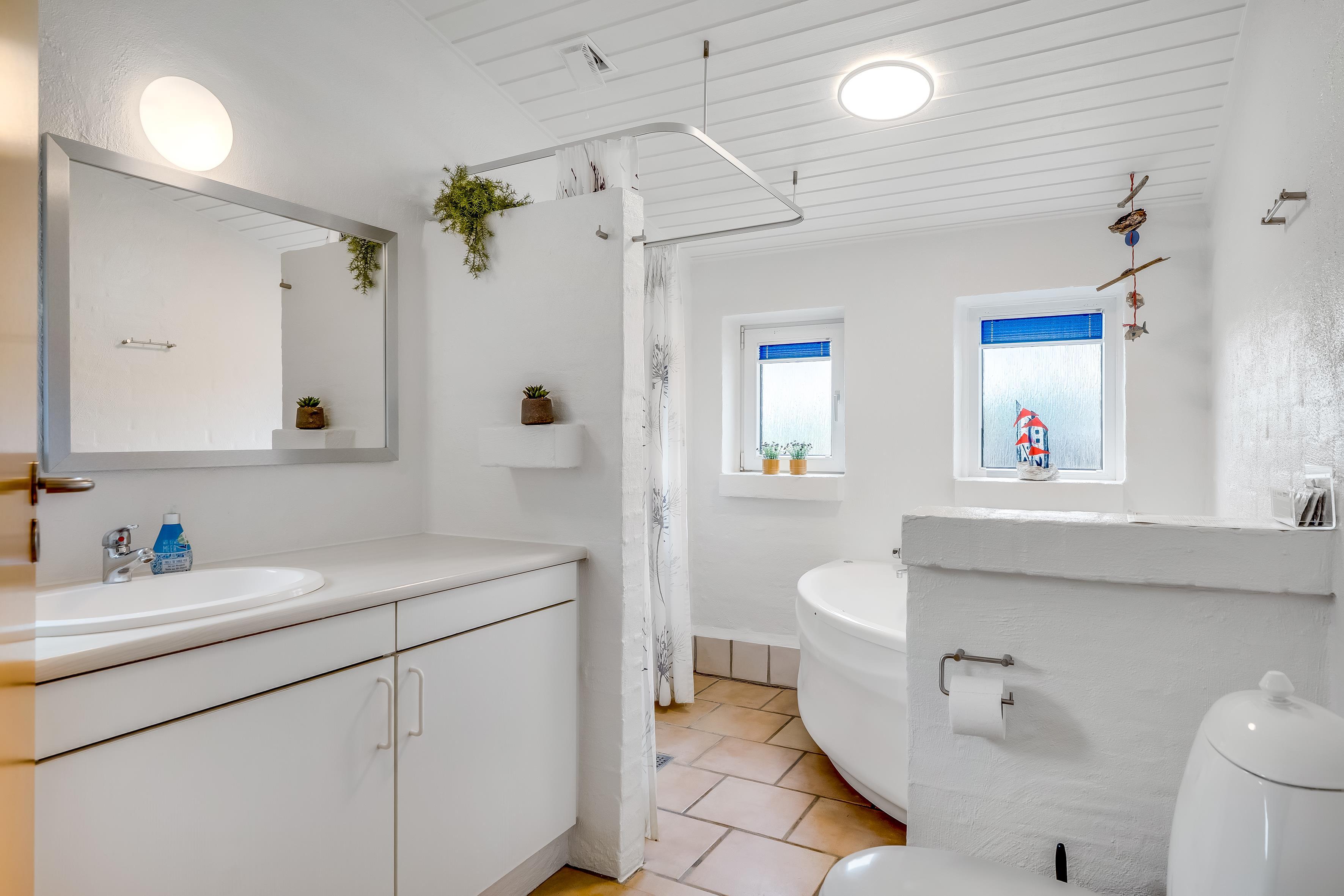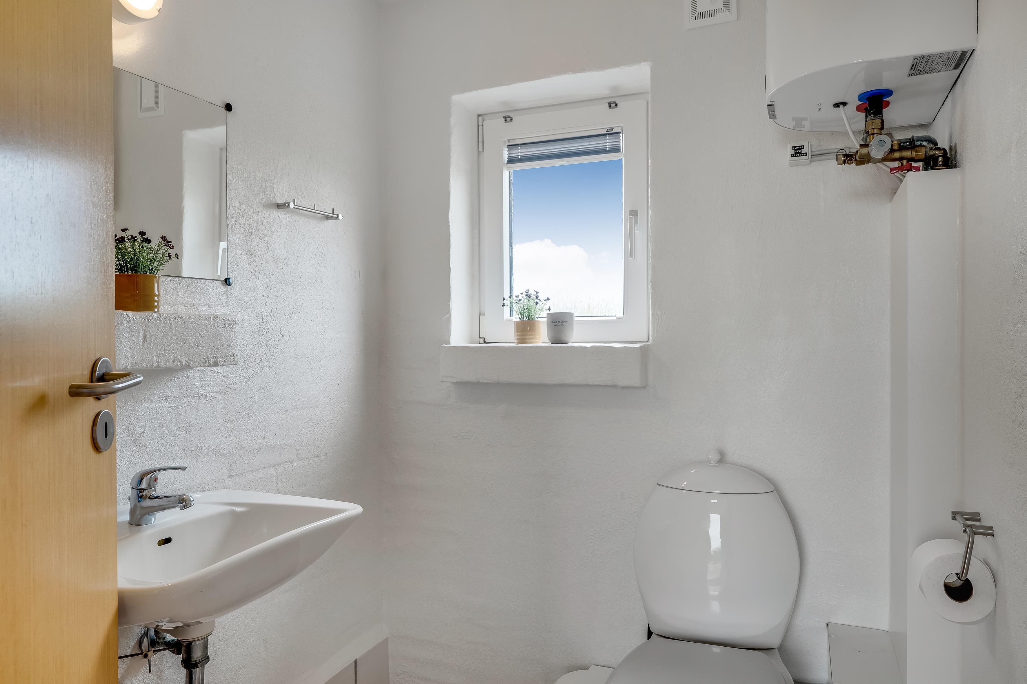 Det moderne badeværelse er udstyret med toilet, håndvask og bruseniche og gulvvarme, hvilket gør det ekstra behageligt at træde ind på kolde morgener. Huset har også et ekstra gæstetoilet, hvilket sikrer, at der aldrig er lange ventetider, selv når alle er hjemme. På Badeværelset er der desuden et indendørs spabad, hvor du kan slappe af og nyde lidt velvære efter en lang dag.