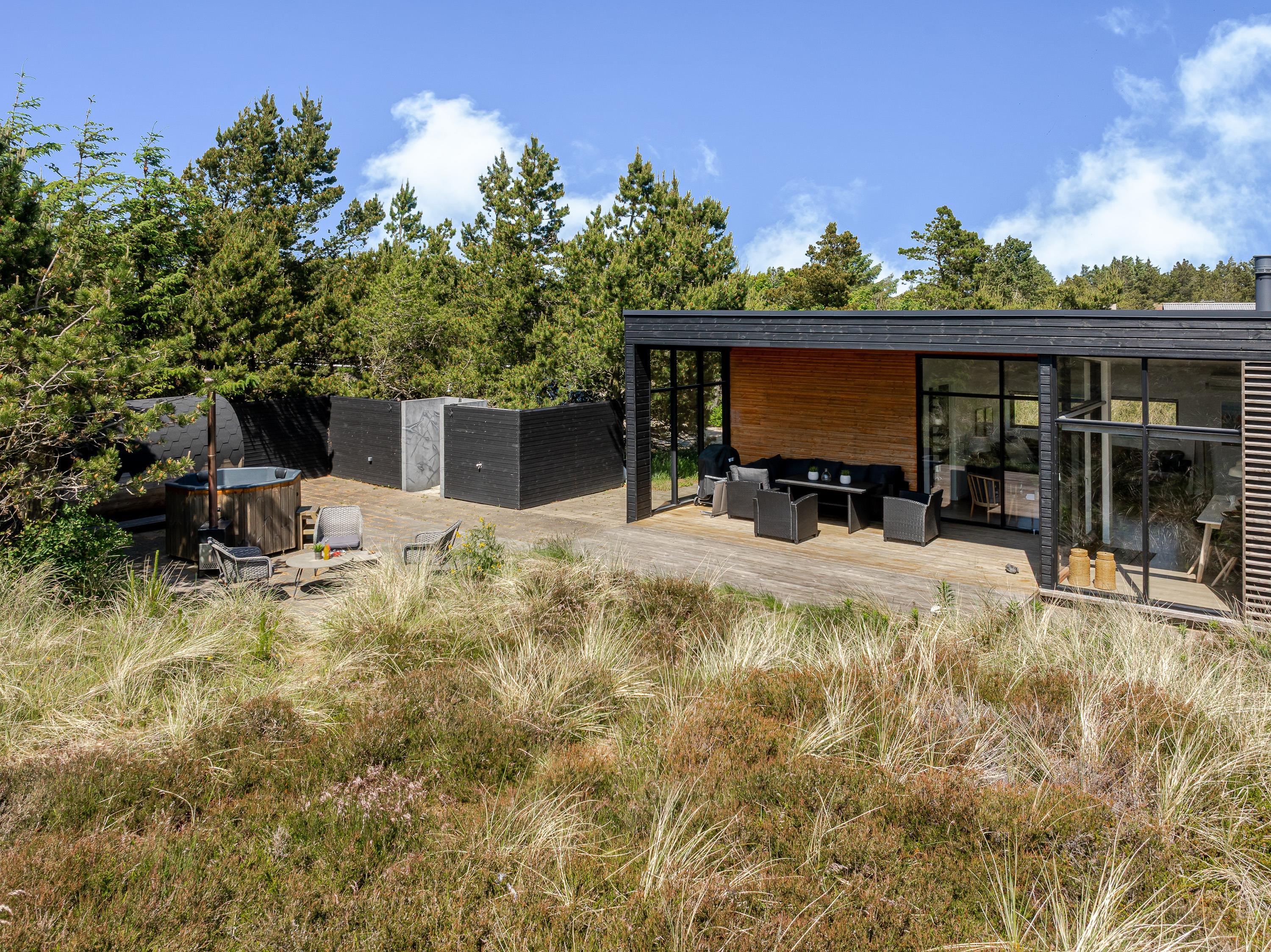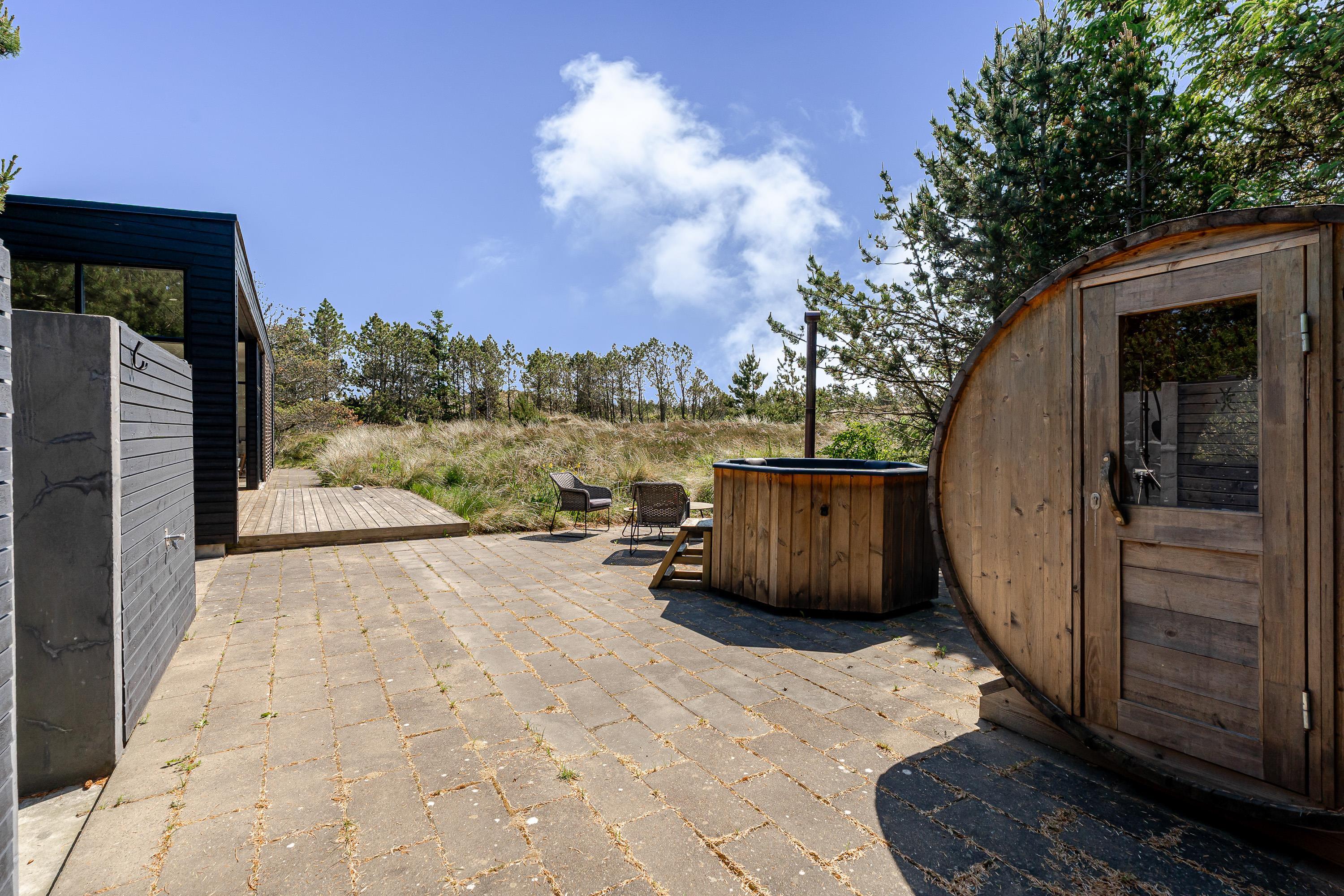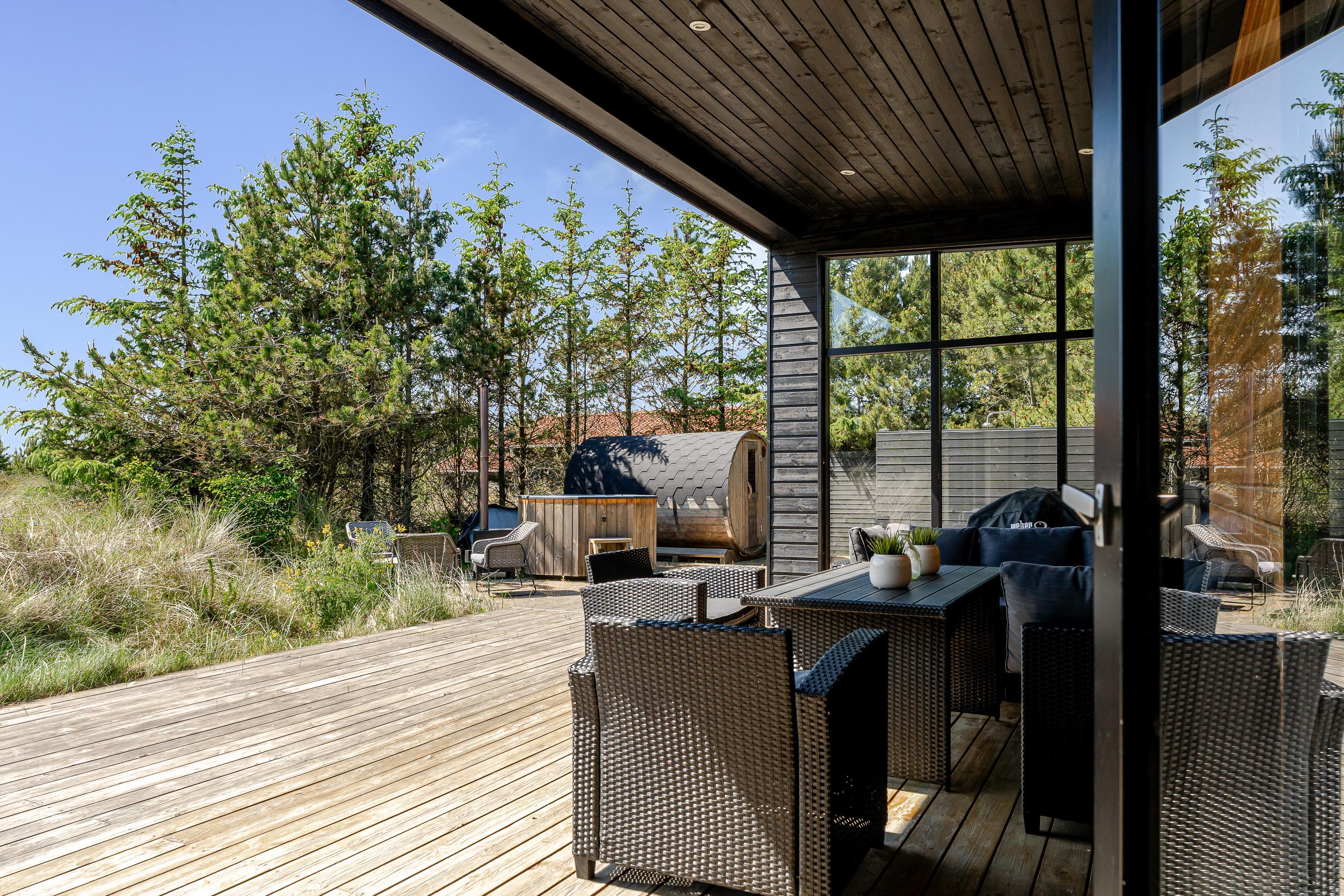 Udendørsområdet er lige så imponerende som det indendørs. Nyd den overdækkede terrasse, hvor du kan sidde og slappe af med en god bog eller nyde en kop kaffe om morgenen. Slap af i det 6 personers vildmarksbad, der kan rumme op til 5 personer, eller forkæl dig selv med en afslappende stund i udesaunaen. Udebruseren er perfekt til de varme dage, og den store have giver masser af plads til udendørs leg og aktiviteter.