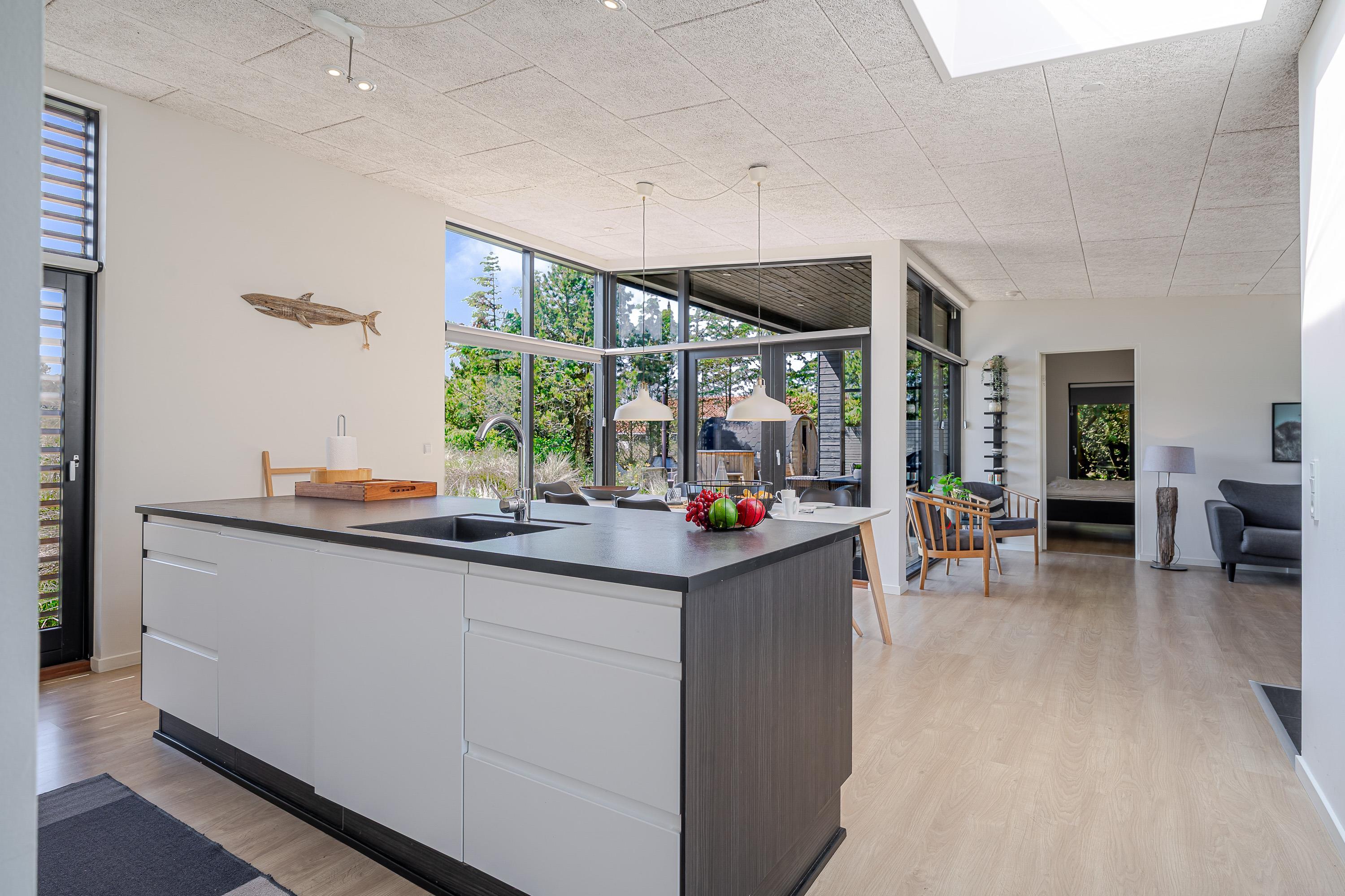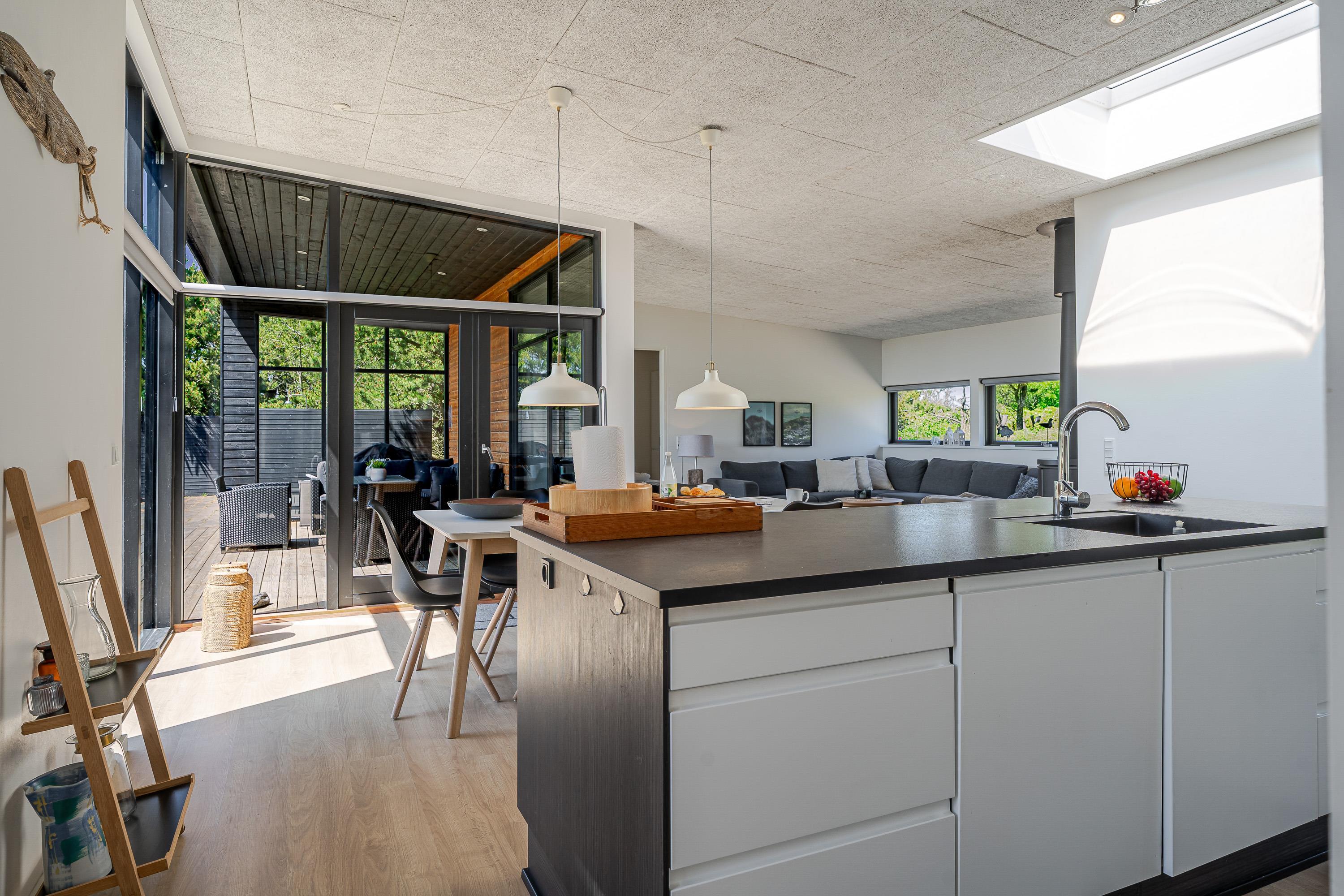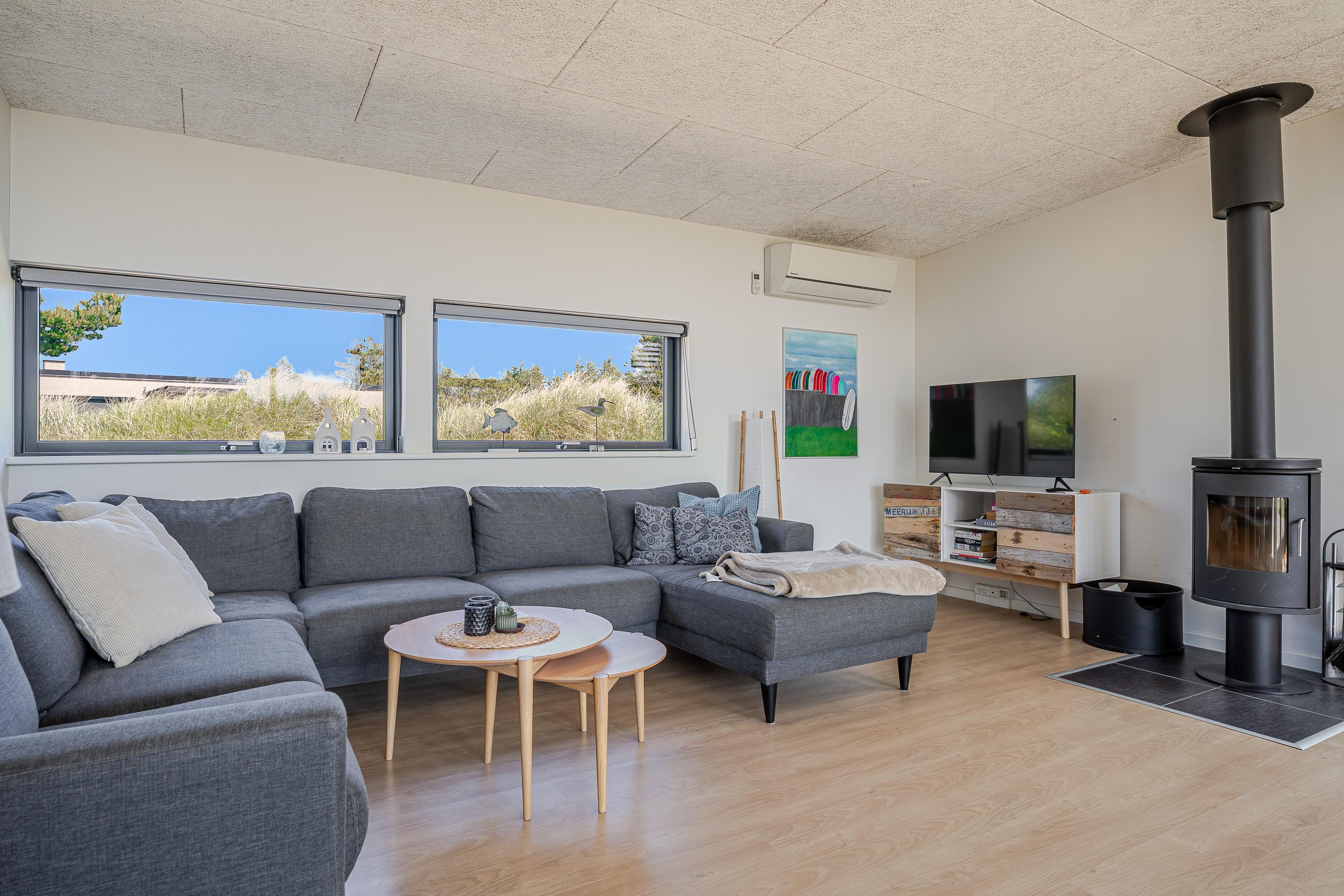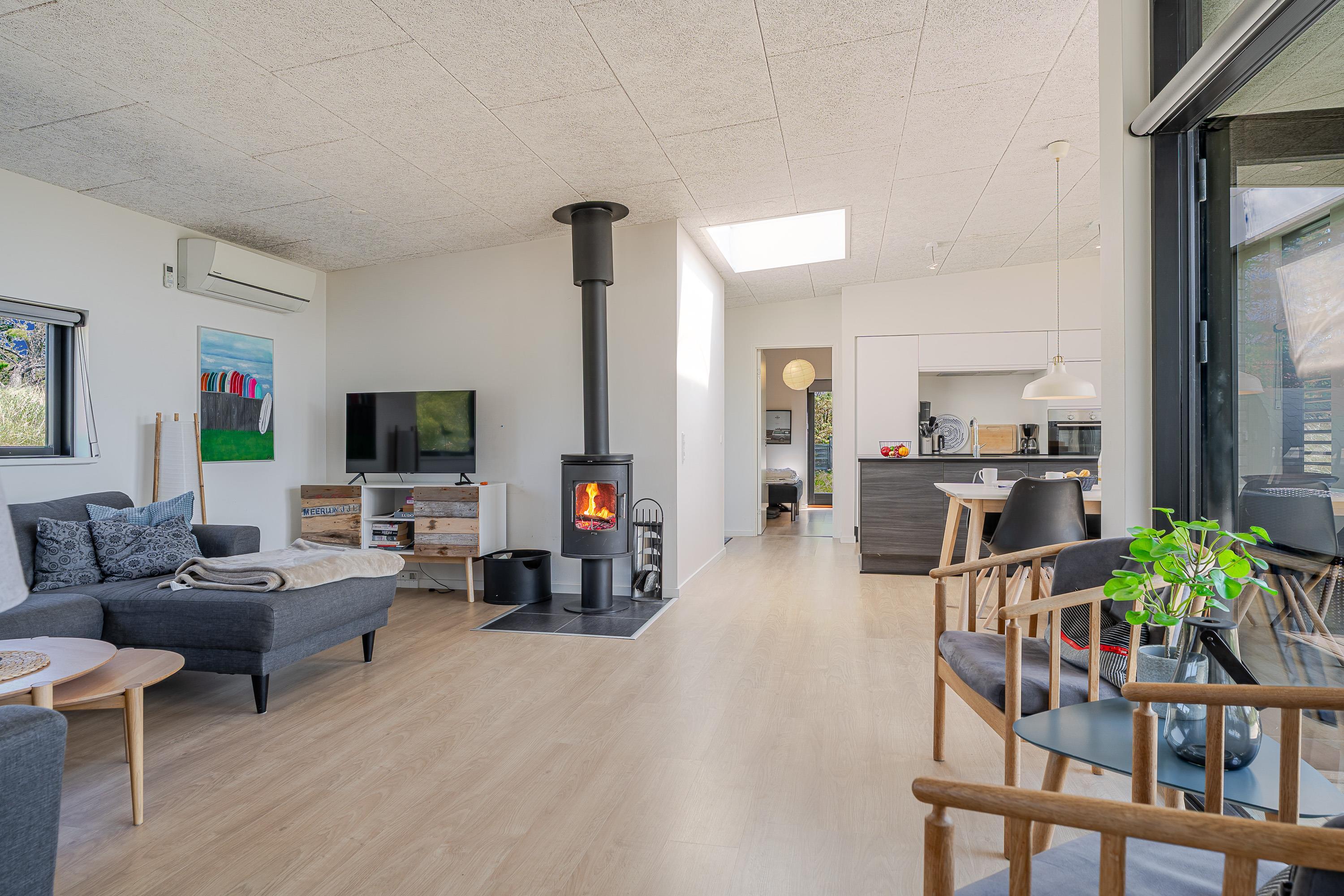 Når du træder ind i huset, bliver du mødt af en lys og indbydende atmosfære, der er skabt af de åbne rum og moderne indretning. Stuen er udstyret med en brændeovn, der ikke blot tilføjer varme, men også en hyggelig stemning på kolde aftener. Her kan du slappe af foran husets TV, hvor du kan benytte Chromecast til at streame dine yndlingsprogrammer. Det trådløse internet sikrer, at du altid er forbundet, hvis du har brug for det.