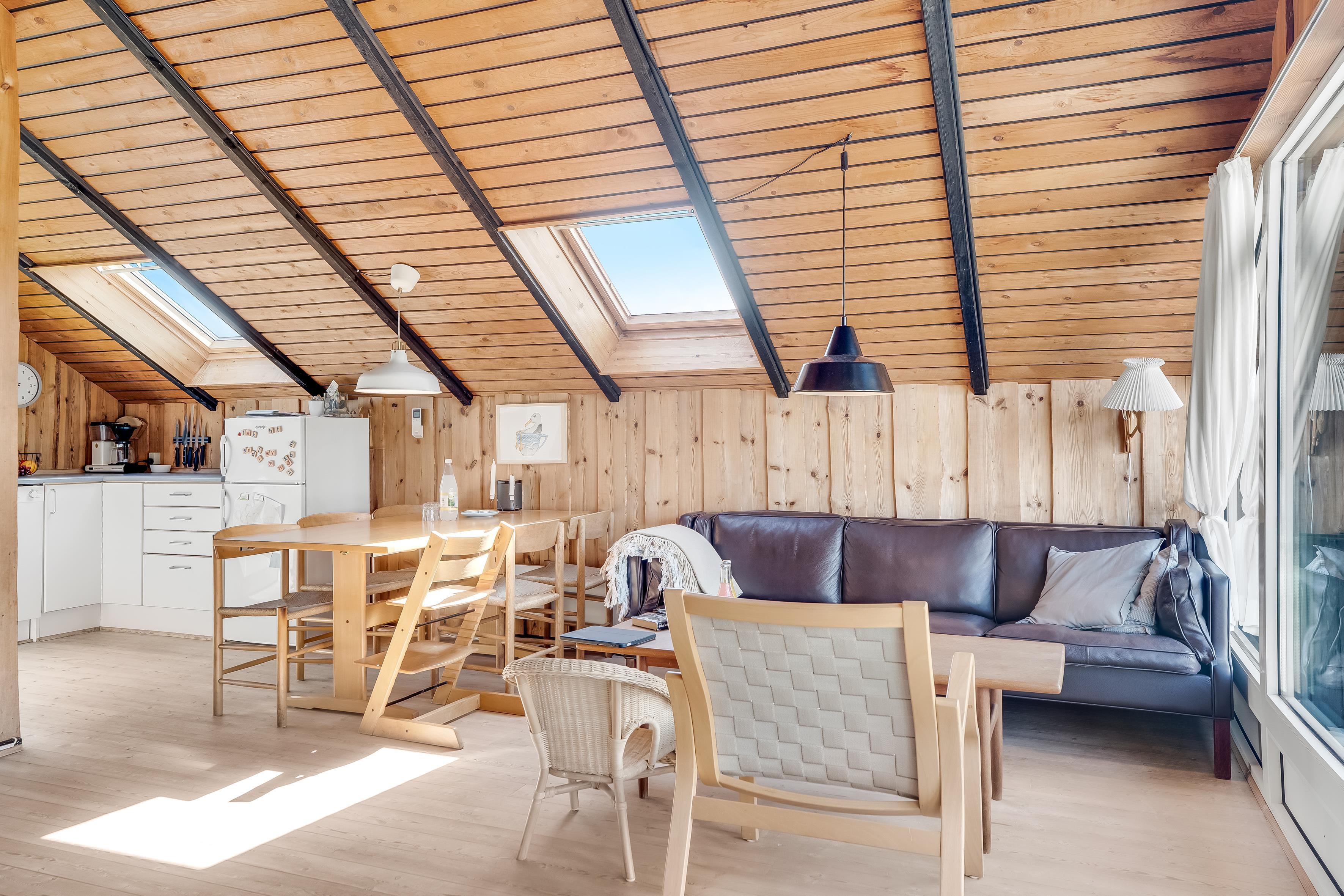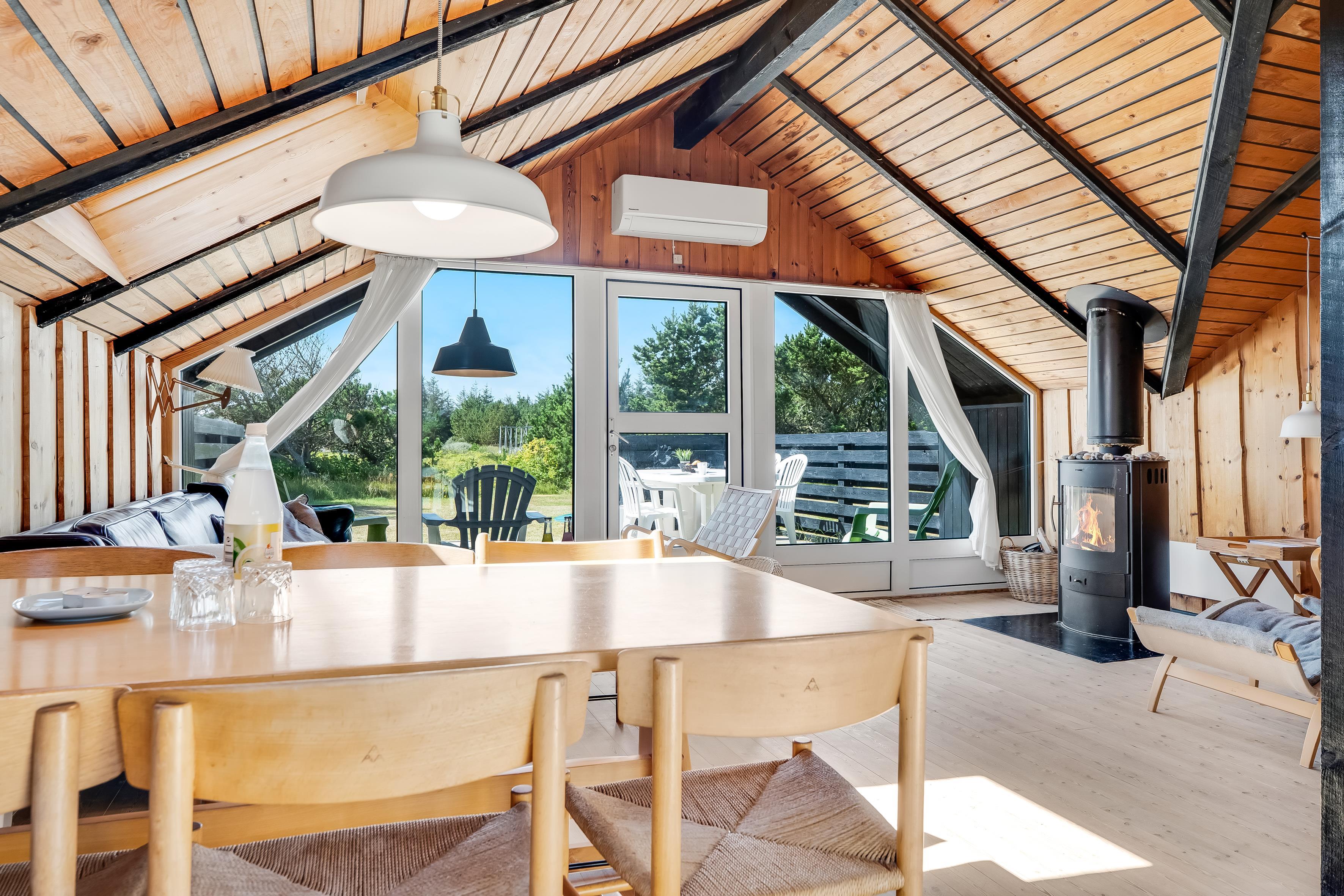 Det moderne badeværelse er udstyret med gulvvarme, bruser og toilet, og den praktiske vaskemaskine, gør det nemt at holde tøjet friskt under hele opholdet. I stuen finder I en hyggelig brændeovn, der skaber en varm og indbydende atmosfære på køligere aftener, samt en energibesparende varmepumpe, der også kan fungere som aircondition, sikre et behageligt indeklima.