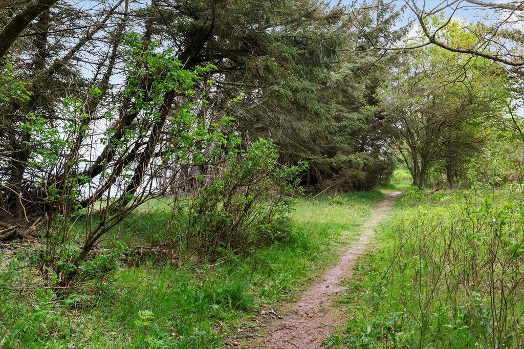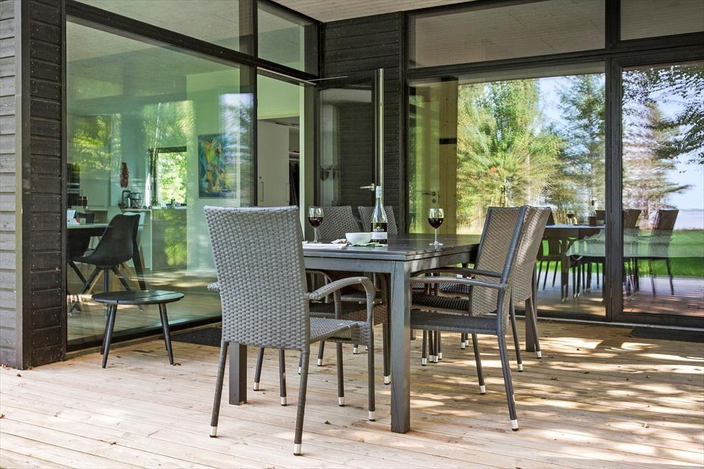 Den 2788 m2 store grund byder på en stor græsplæne og høje træer, der omkranser udearealerne. Der er dog en åbning i bevoksningen mod vest, så I kan se lige ud på vandet fra både sommerhuset og den vestvendt terrasse. En del af terrassen er overdækket, og i det ene hjørne er der en niche med udendørs bruser, så I kan tage morgenbad til lyden af fuglesang.