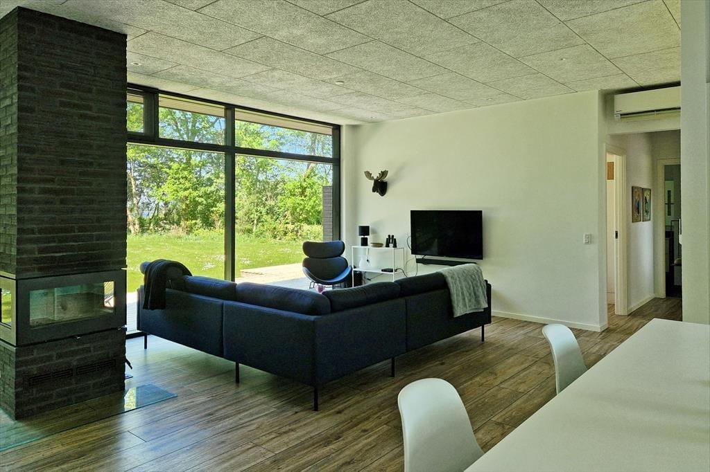 Ferien kommer til at udspille sig i moderne og rummelige rammer, for det 141 m2 store sommerhus er opført i 2019 og indrettet på stilfuld vis. Der er dobbeltseng på alle fire soveværelser, og på to af dem er der derudover en køje ovenover, så det er muligt at samle venner eller familie til en god fællesferie. Ved entréen ligger et badeværelse med vaskemaskine og tørretumbler, mens husets andet badeværelse har dør ind til en sauna og videre ud til terrassens udebruser. Det er herligt at kunne slappe af i den varme sauna efter en tur til fjorden – men mon ikke I kommer til at tilbringe endnu flere timer i sommerhusets smukke opholdsrum, hvor stue og køkken er forenet. Her er der alt, hvad I skal bruge, inklusiv indbygningspejs, varmepumpe med køling og fladskærms-tv, men det allerbedste er nu næsten de store, vestvendte vinduespartier, der inviterer solen og limfjordsudsigten indenfor.