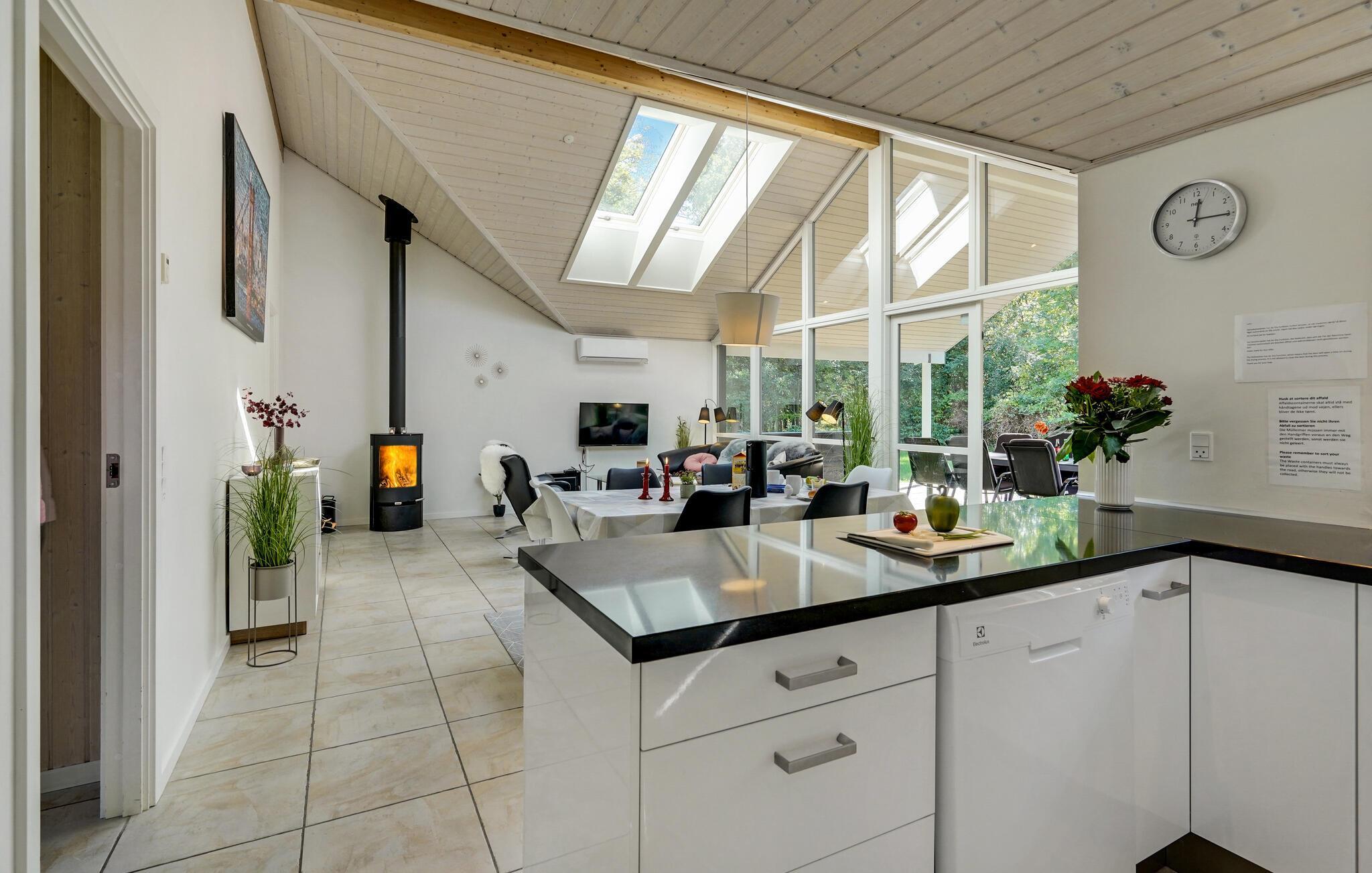 Lækkert lyst feriehus med skønt samtalekøkken i kombination med spisestue/stue med brændeovn, 2 gode værelser samt skønt badeværelse med spa samt brus, endvidere gæstetoilet, entre samt bryggers. Fra stuen udgang til dejlig både åben og overdækket terrasse, hvor solen kan nydes i fulde drag.