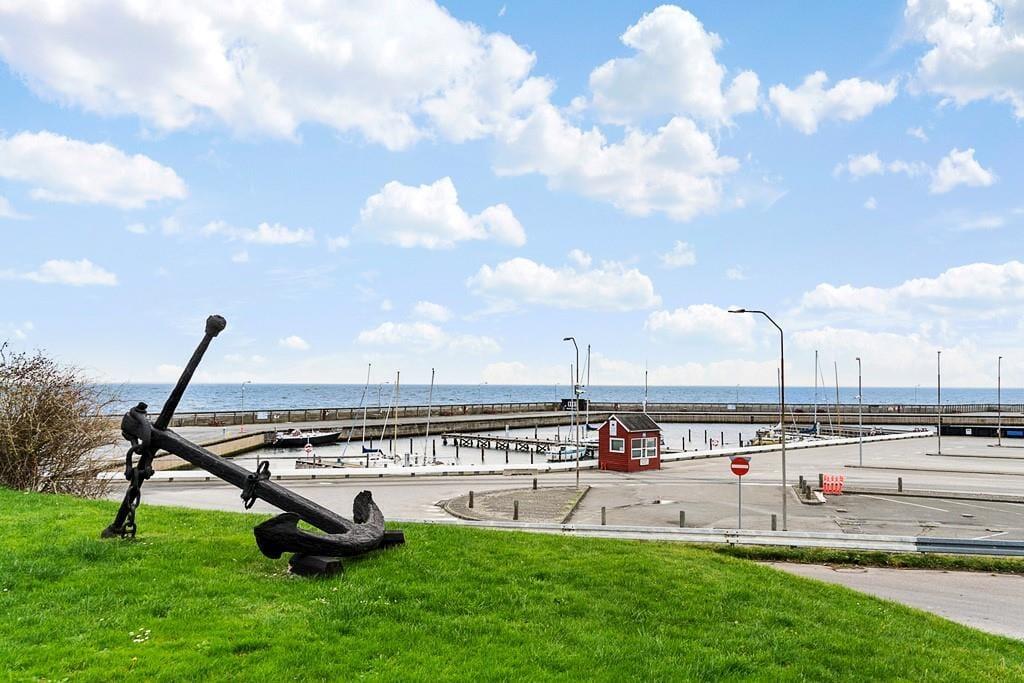 I stuen er der en god sofa og et TV, så her kan I slappe helt af efter en dag fyldt med oplevelser på Samsø. De lyse lofter, store vinduer og havedøren giver masser af naturligt lys, og I kan nyde udsigten til haven og havnen.