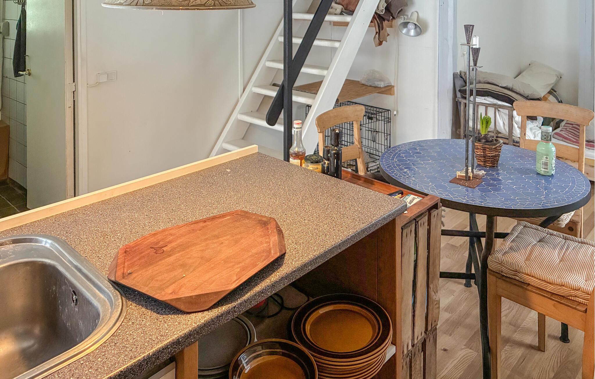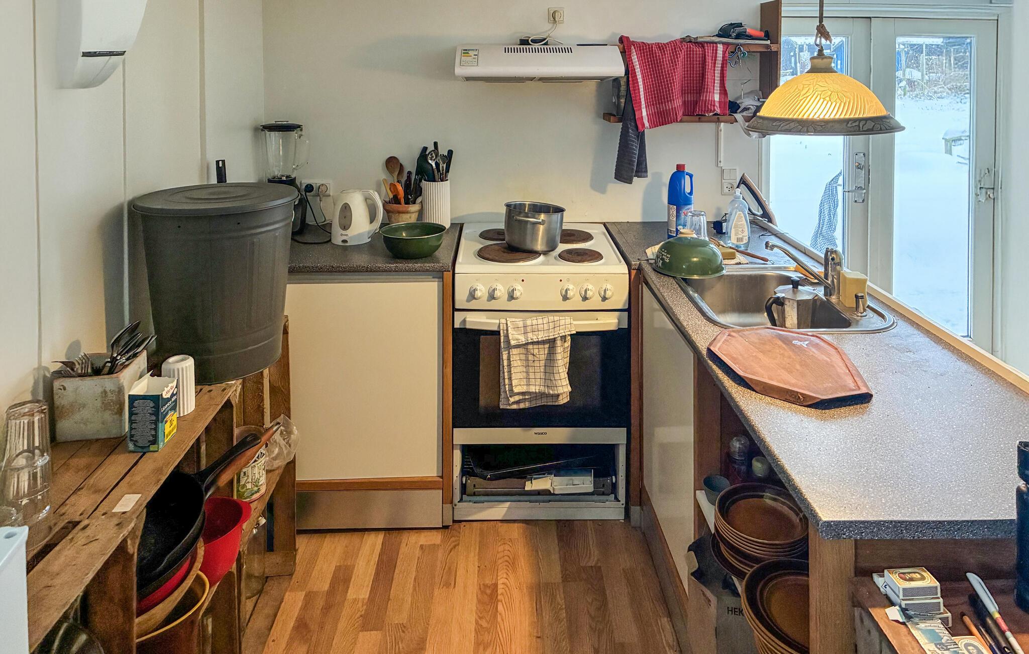 I dette komfortabelt møblerede feriehus vil I opleve afslappende dage i landlige omgivelser. Indenfor finder I enkle, funktionelle møbler med trægulve og en åben planløsning. Tag plads ved det runde spisebord og brug det kombinerede opholds- og køkkenområde som et centralt samlingssted. Tilbered jeres egne måltider i det kompakte køkken og organiser jeres dag.