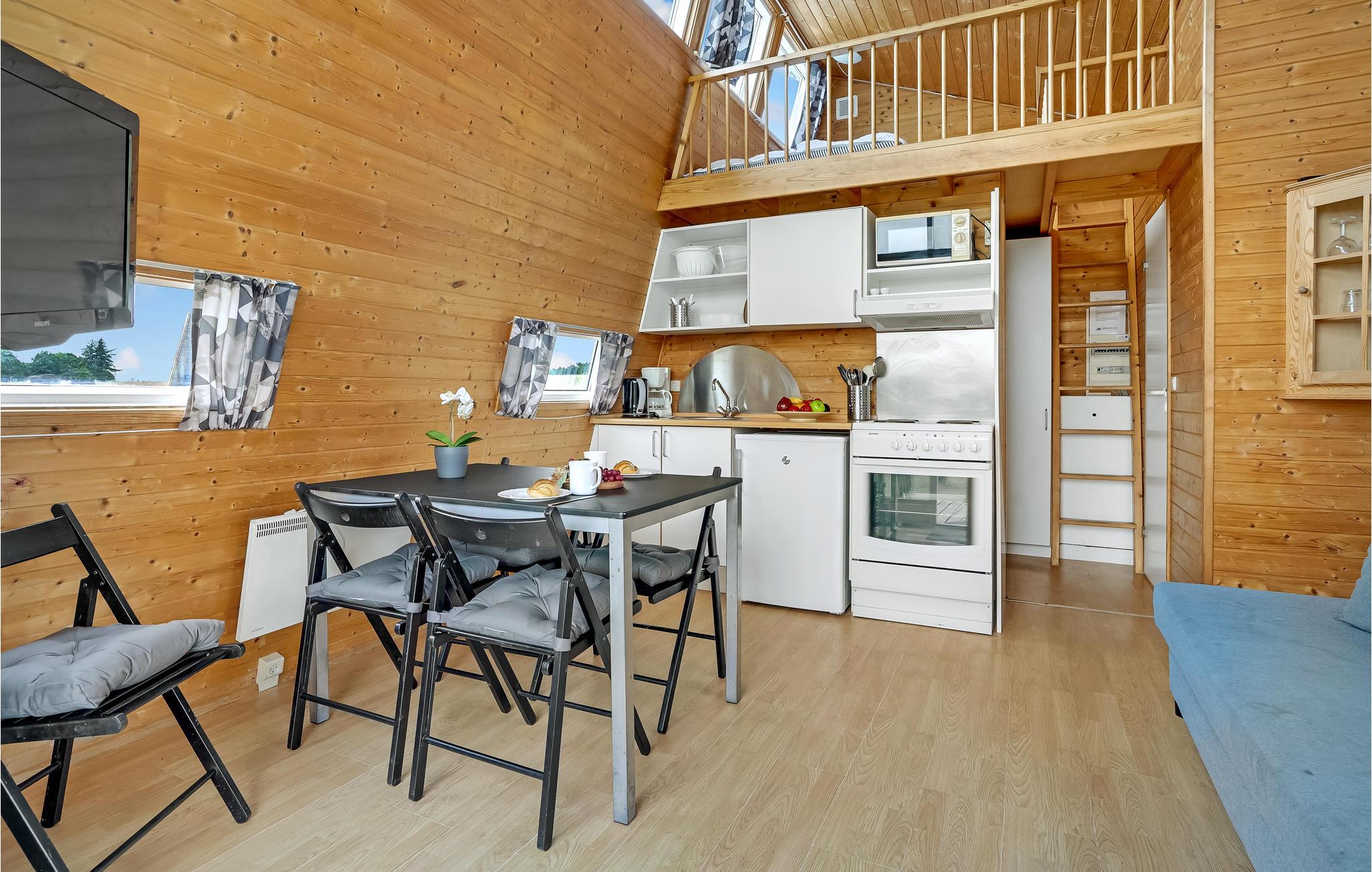Denne feriebolig er det perfekte valg for en lille familie med børn, eller for jer, der skal overnatte i forbindelse med kurser, koncerter eller familiebesøg i området. Føl jer hjemme i dette moderne træhus i Tiny House-stil. I finder alle de møbler, I har brug for til et afslappende ophold. I kan nyde godt af de store vinduer, der lukker masser af lys ind i huset selv på overskyede dage, hvilket giver det en vidunderlig åben og rummelig atmosfære. Når vejret er godt, kan I trække jer tilbage til den delvist overdækkede terrasse og nyde måltiderne i fred og ro. Større børn vil helt sikkert blive begejstrede for den åbne hems med ovenlysvindue. Her strømmer solstrålerne ind i huset om dagen, og om natten åbner der sig en vidunderlig stjernehimmel over jer.