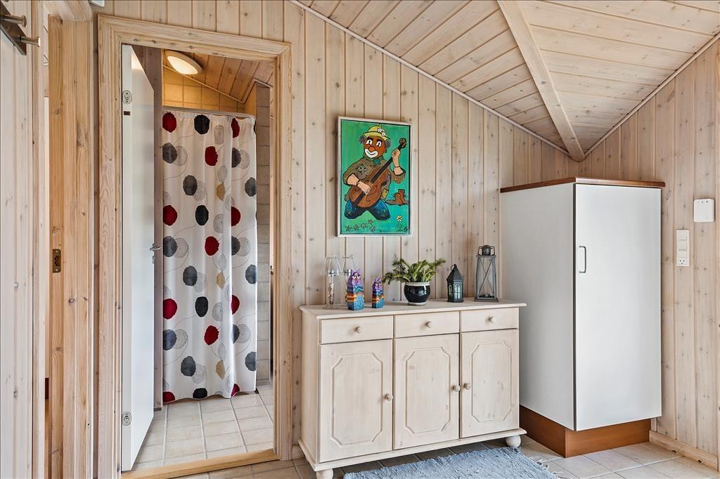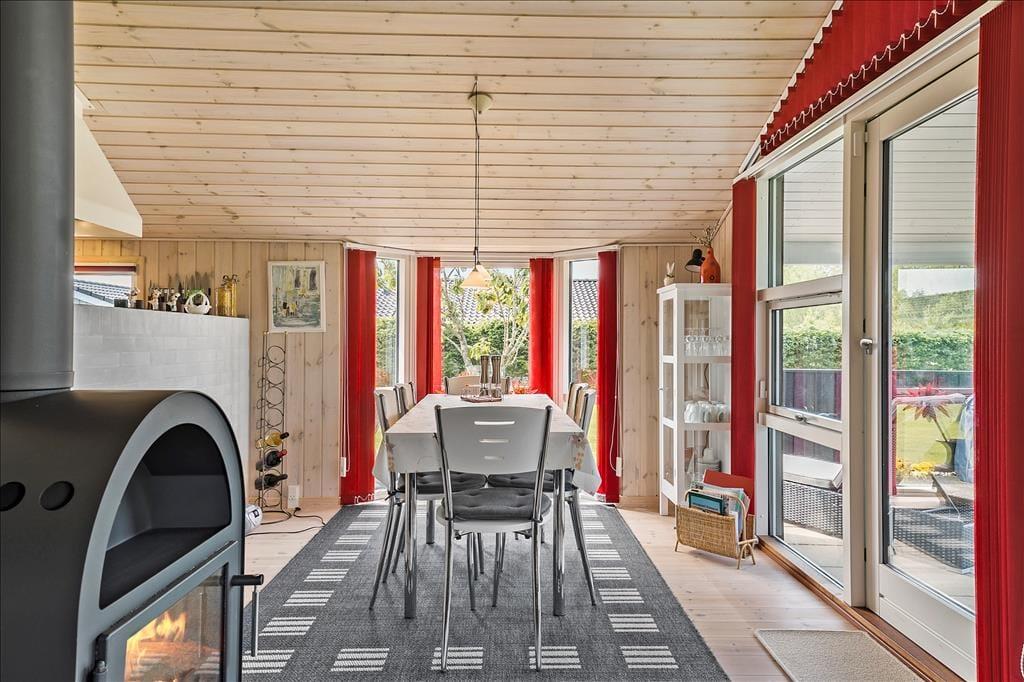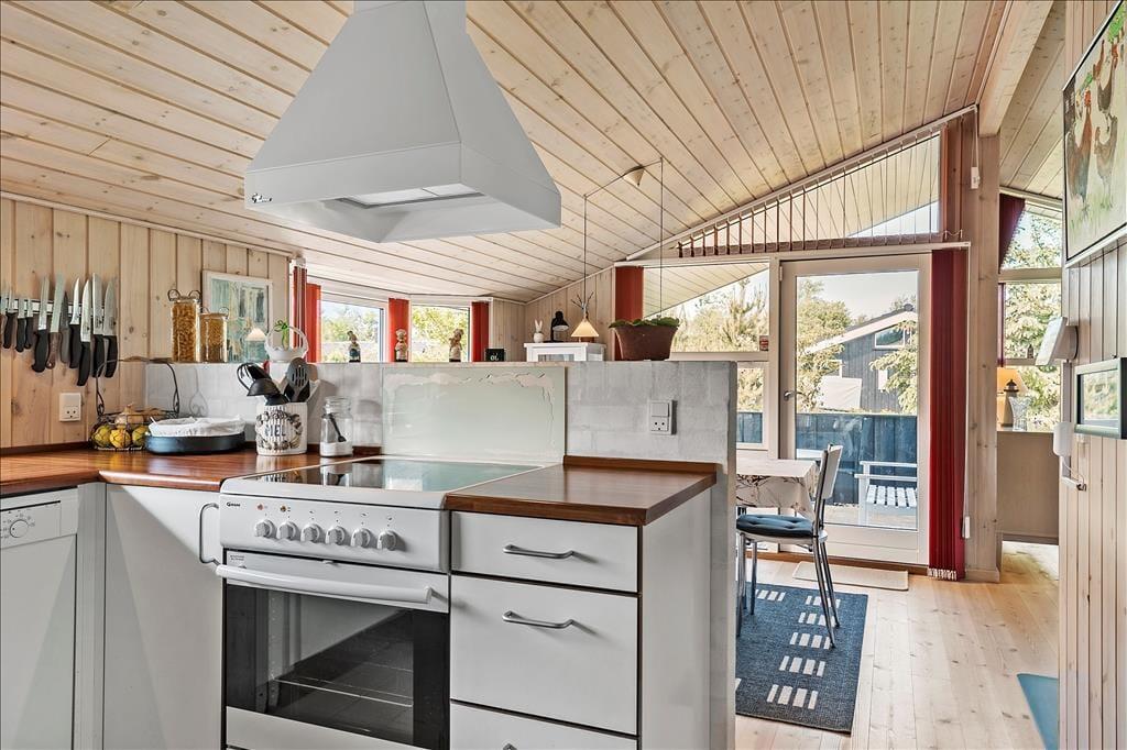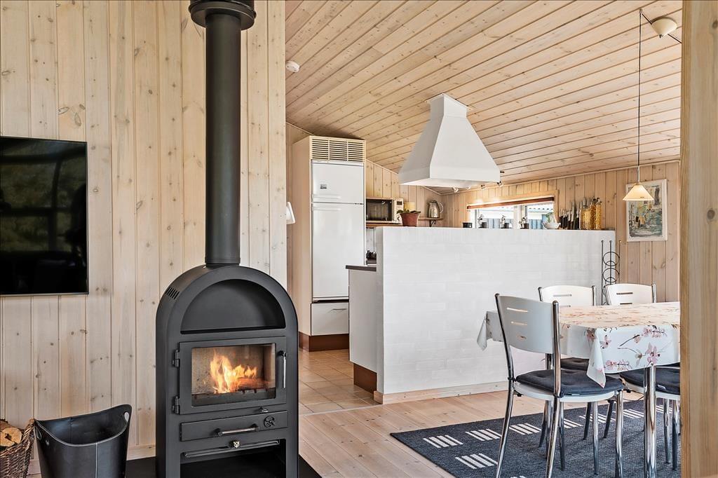 Atmosfæren er lys og indbydende inden døre i sommerhuset, der er en velbygget ejendom fra 2006. Hver eneste af husets 72 m2 er fornuftigt udnyttet, og alle rum er velindrettede: Den rummelige entré er udstyret med vaskemaskine, og på de tre soveværelser kan I se frem til en god nats søvn i de komfortable senge. På badeværelset er der gulvvarme, så I ikke får kolde tæer, når I træder ud fra brusebadet, og takket være den åbne forbindelse mellem køkken og stue kan I nyde varmen fra brændeovnen og hinandens selskab, selv når aftensmaden skal forberedes.