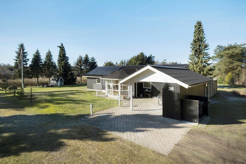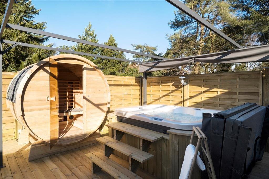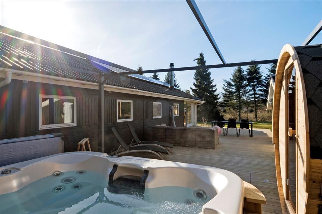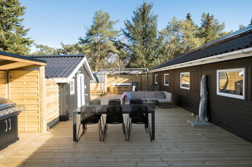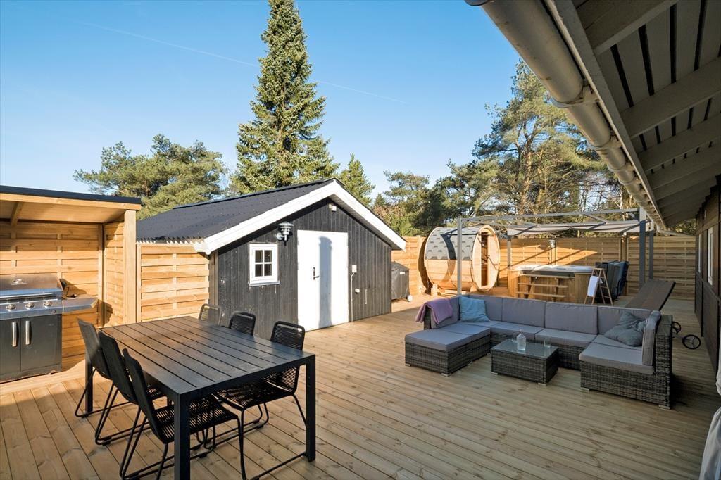 Udearealerne er mindst lige så tjekkede som selve sommerhuset. Den 948 m2 store grund er nemlig pænt anlagt med en stor græsplæne, flisebelagt indkørsel op til carporten og terrasse mod både øst og vest. Særligt terrassen mod vest vil blive alle gæsters favoritsted. Her finder du nemlig husets ude spa og saunatønden, det er en ugeneret oase hvor der er god plads til udelivet. Solsenge og loungesæt indbyder til afslapning mens der stadig er god plads til at dække op til frokosten der kan tilberedes på husets store grill. Der er mulighed for at lukke terrassen helt af, hvilket hundeejere og børnefamilier formentlig kan sætte pris på.