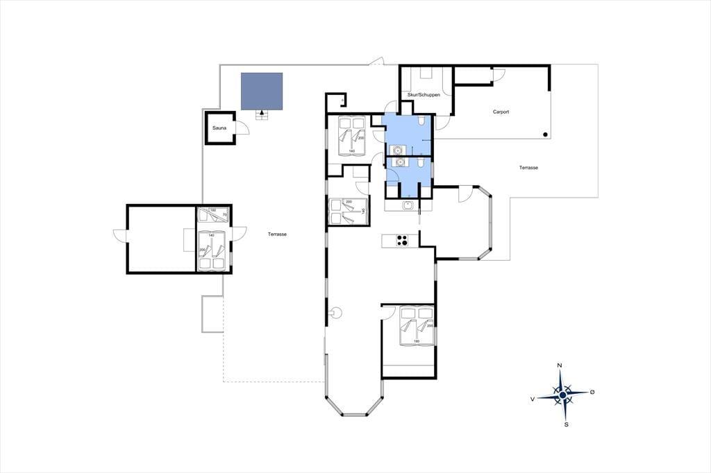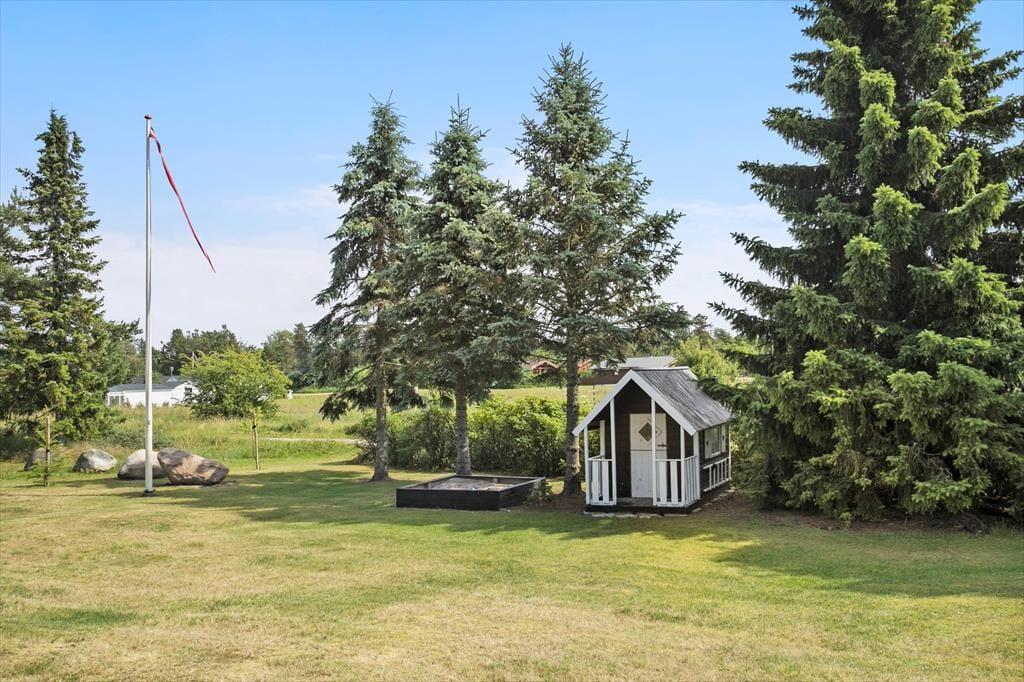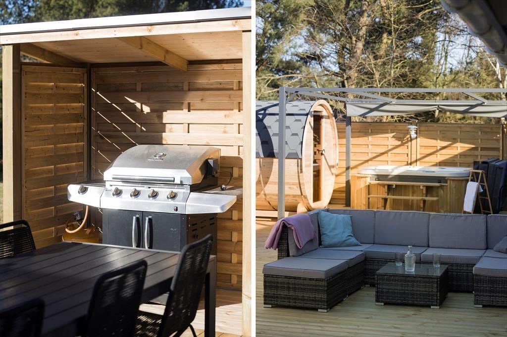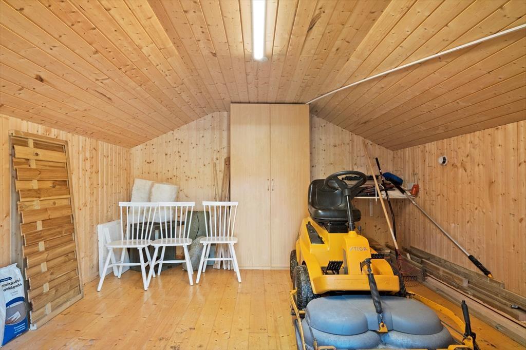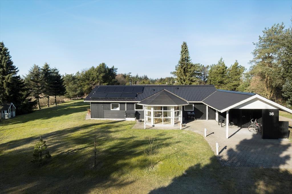 Udearealerne er mindst lige så tjekkede som selve sommerhuset. Den 948 m2 store grund er nemlig pænt anlagt med en stor græsplæne, flisebelagt indkørsel op til carporten og terrasse mod både øst og vest. Særligt terrassen mod vest vil blive alle gæsters favoritsted. Her finder du nemlig husets ude spa og saunatønden, det er en ugeneret oase hvor der er god plads til udelivet. Solsenge og loungesæt indbyder til afslapning mens der stadig er god plads til at dække op til frokosten der kan tilberedes på husets store grill. Der er mulighed for at lukke terrassen helt af, hvilket hundeejere og børnefamilier formentlig kan sætte pris på.